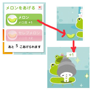 --- 在這個選單中有三項照顧水滴的功能,其中給哈蜜瓜這個功能是原本就有的,但是在這次稍作變動:點選給哈蜜瓜後,在頁面右方會出現哈蜜瓜視窗,選擇綠色或粉色的哈蜜瓜後,地板上會出現一片哈蜜瓜,這時候只要把哈蜜瓜拉到水滴的身上就算完成一次餵食了,一天最多可以餵5片綠色哈蜜瓜,可以增加5度。