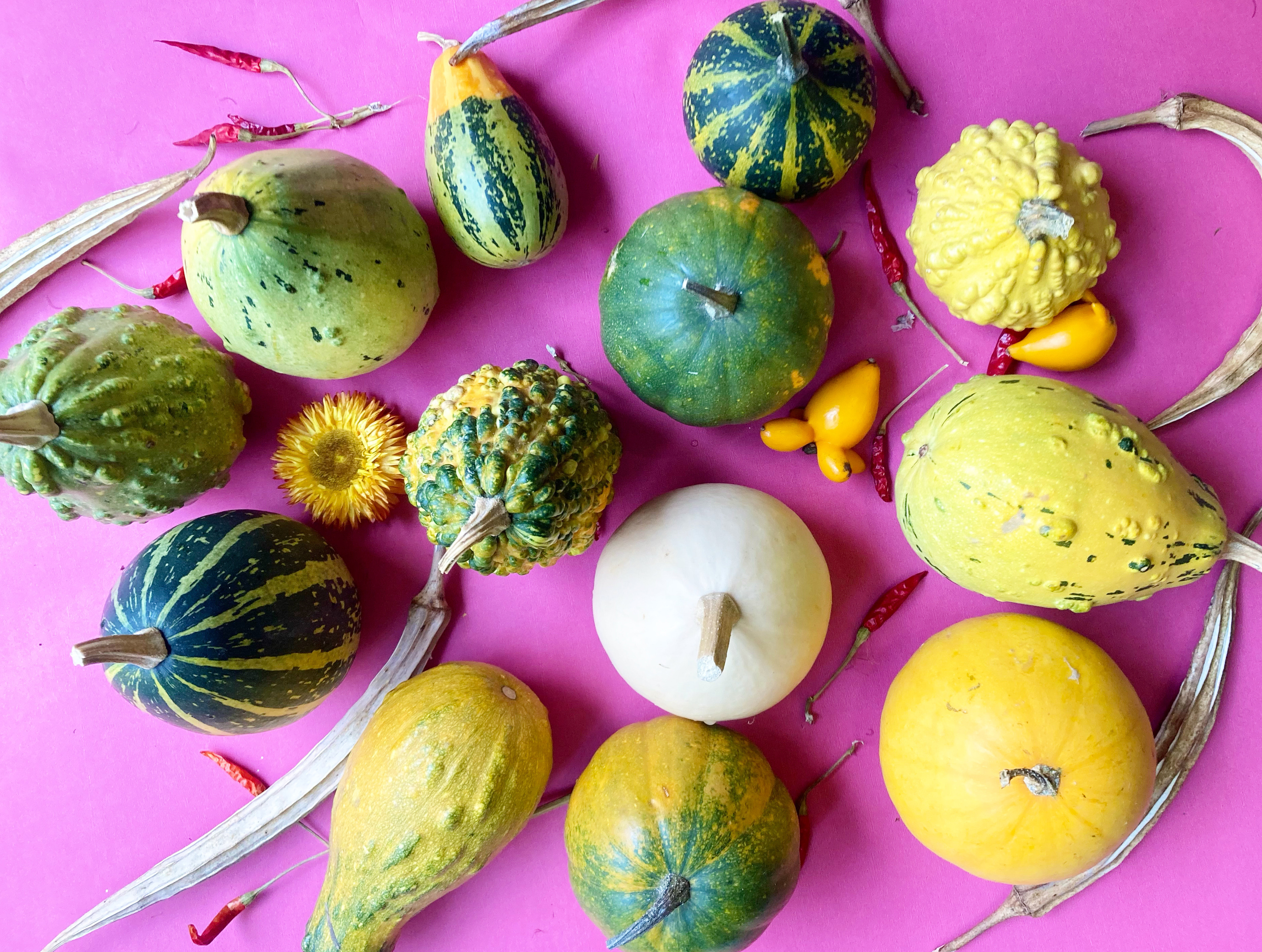 小さくて可愛いものから、形がユニークで思わず飾りたくなるようなものまで、多種多様なかぼちゃを入荷しています。オレンジやパープルのお花と組み合わせれば、ぐっと華やかで楽しい雰囲気に。