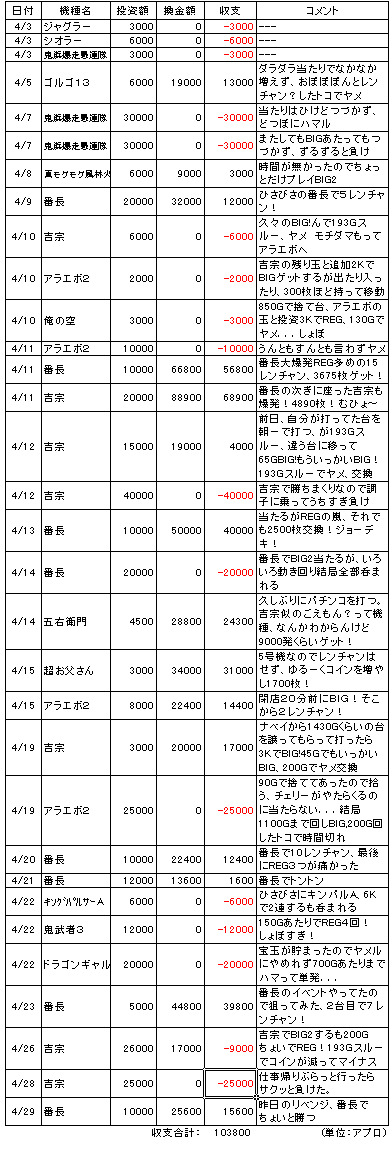 ・4月の収支発表ぉ~んわすれちょった、4月の収支発表してなかった 4月は前半に調子悪かったけど 後半にのびて プラス収支になりましたー わーいわーい しかし、5月初めでボコマケなので あっというまに無くなってる... なかなかコンスタントに勝つことは でけんわ~ とほ~ ちゅーわけで↓が4月の収支ですばい