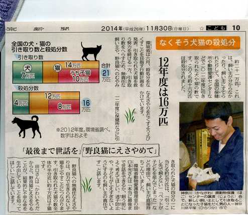 読むと、環境省動物愛護管理室の職員の話があり、「ノラ猫に餌をやめて」の見出しが大きく出ていました。