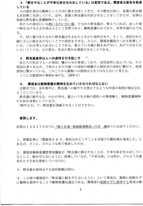 そこで、民間の動物愛護団体が、ノラのために、環境大臣に抗議文と質問書を出した。 質問の回答は12月17日まで。返事が来ましたらお知らせします。