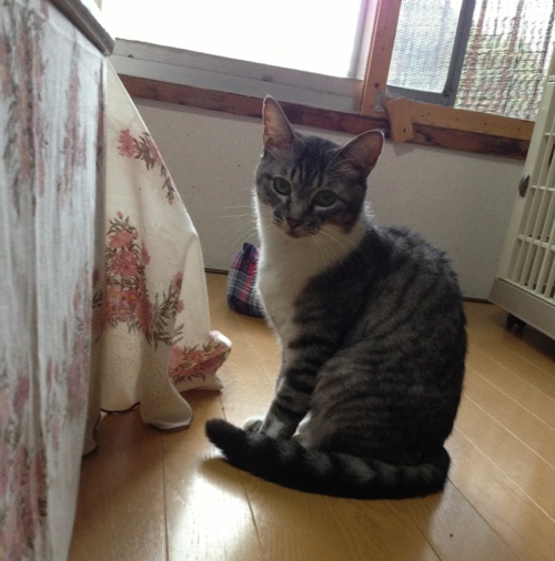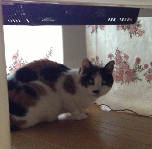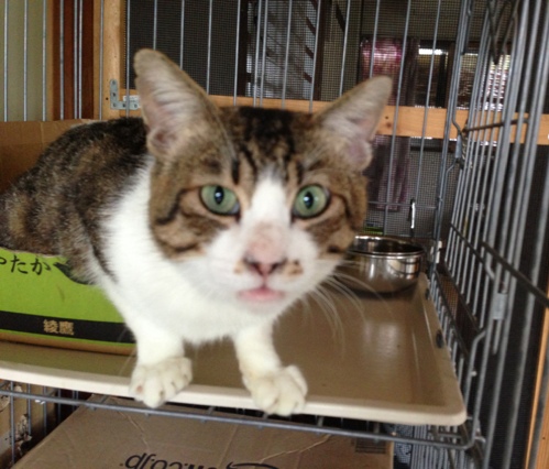 台所のケージで人馴れ中のミーコさん。