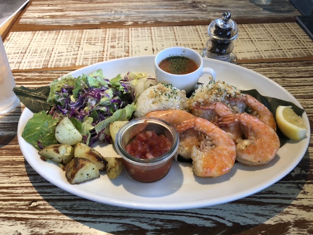 まずは腹ごしらえ^_^ コナズ珈琲というハワイアンレストランでゴージャスなランチをいただきました。ガーリックシュリンププレート、本当に美味しかった!