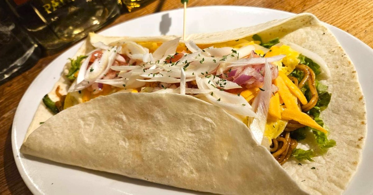 まずは「季節のタコス(麻婆モッツァレラ)」からいただこうと持ち上げてみれば、おっ、こちらのトルティーヤはソフトなタイプなんだな