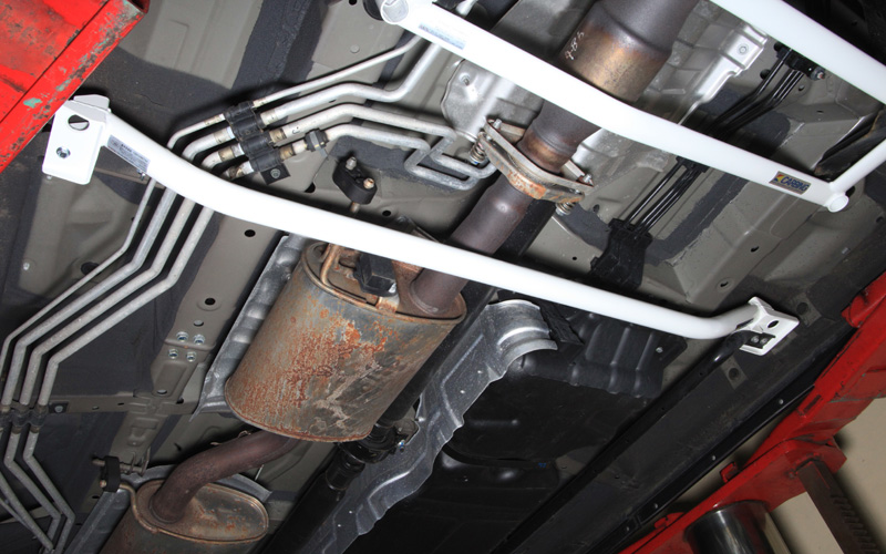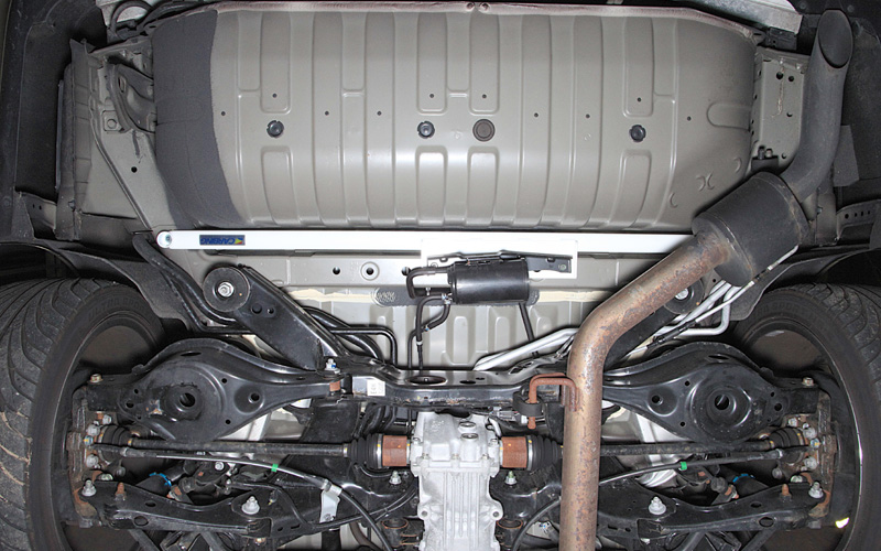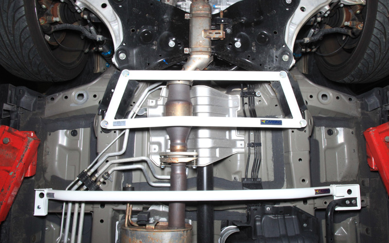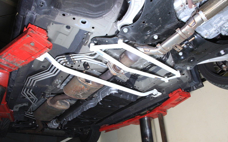 | ブレーキング時やコーナリング時に掛かるストレスを車のボディは常に 負荷として入力されています。そこで、フレームブレースを装着することによりボディ (フレーム)剛性を高め、ボディのねじれを抑えます。下回りの剛性をあげる事により、 ブレーキング時やコーナリング時での安定性や操縦性が向上します。 |