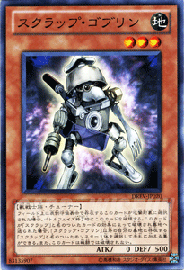 スクラップ・ゴブリン価格確認★遊戯王5D's「DUELIST REVOLUTION(デュエリスト・レヴォリューション)」収録【チューナー・効果モンスター】ノーマル■星3/地属性/獣戦士族/攻 0/守 500■フィールド上に表側守備表示で存在するこのカードが攻撃対象に選択された場合、バトルフェイズ終了時にこのカードを破壊する。このカードが「スクラップ」と名のついたカードの効果によって破壊され墓地へ送られた場合、「スクラップ・ゴブリン」以外の自分の墓地に存在する「スクラップ」と名のついたモンスター1体を選択して手札に加える事ができる。また、このカードは戦闘では破壊されない。【ID:83135907】