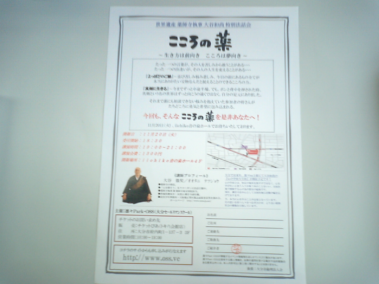 薬師寺・大谷和尚の講 演会11月20日(火)に、音の泉ホールにて行われます。 昨日、OSS(大分セールスマンスクール)の代表・竹下さんとお会いし、ご案内頂きました。竹下さんとは、神社ドットコムのイベントでお世話になった株式会社ダスキン福山の高橋社長のご縁で知り合いました! このおふたりが「大谷和尚のお話は面白い!」と太鼓判を押していたので、安心してオススメできます。 演題が「こころの薬」なので、最近ネガティブになっている方に効くかもしれません。