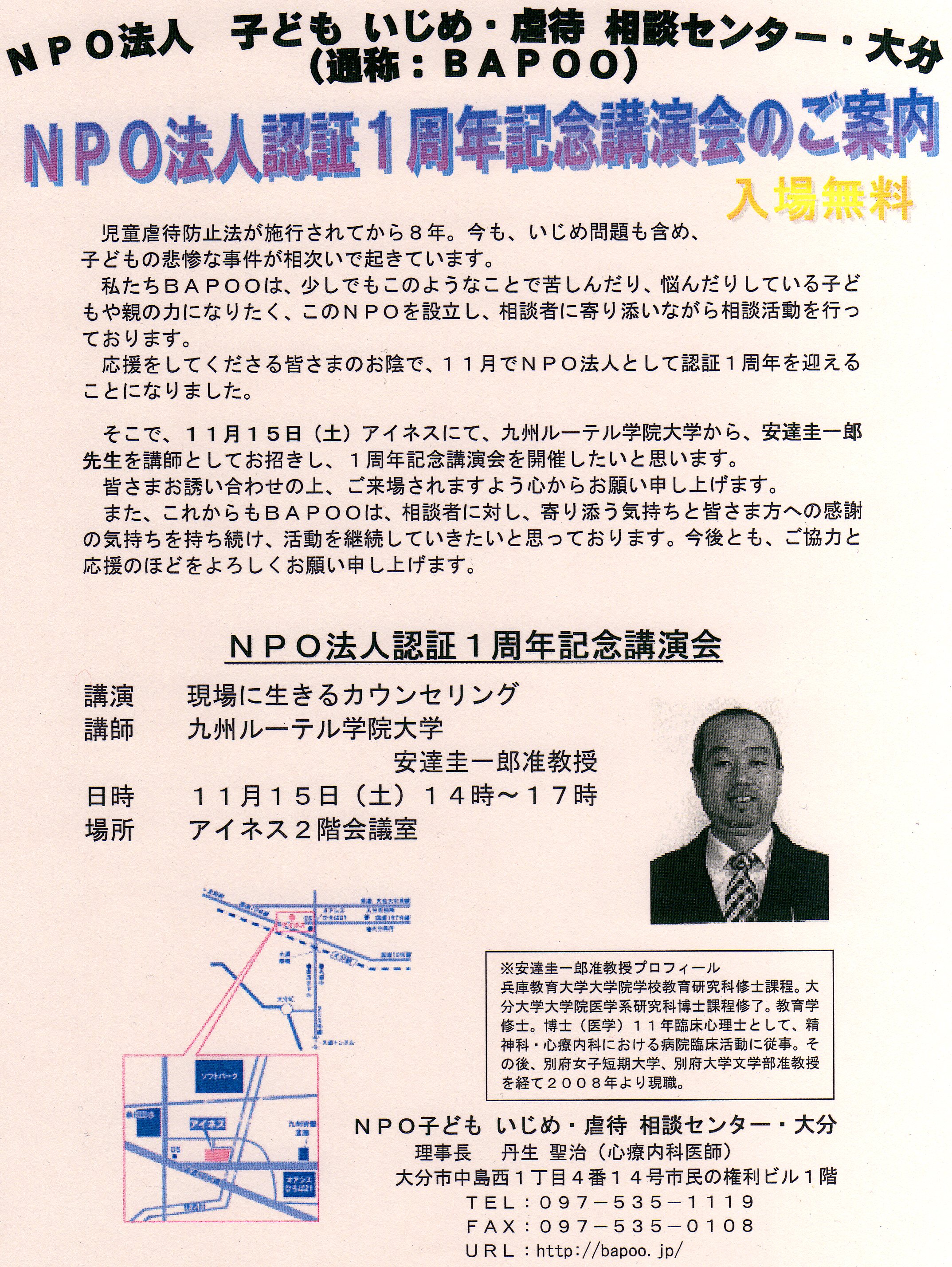 「NPO法人子ども いじめ・虐待 相談センター・大分の1周年記念講演会」