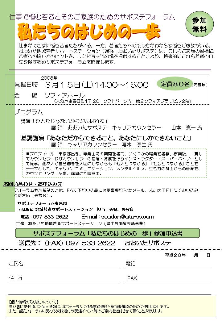 仕事で悩む若者とそのご家族のためのサポステフォーラム2008年3月15日(土)に、開催します。講師には、私のキャリアカウンセリングの師匠である、再木奈生さんがお見えになります。奮ってご参加くださいますようお願い致します。※詳細は写真をクリックしてみてください。申し込みはおおいたサポステ事務局までです。