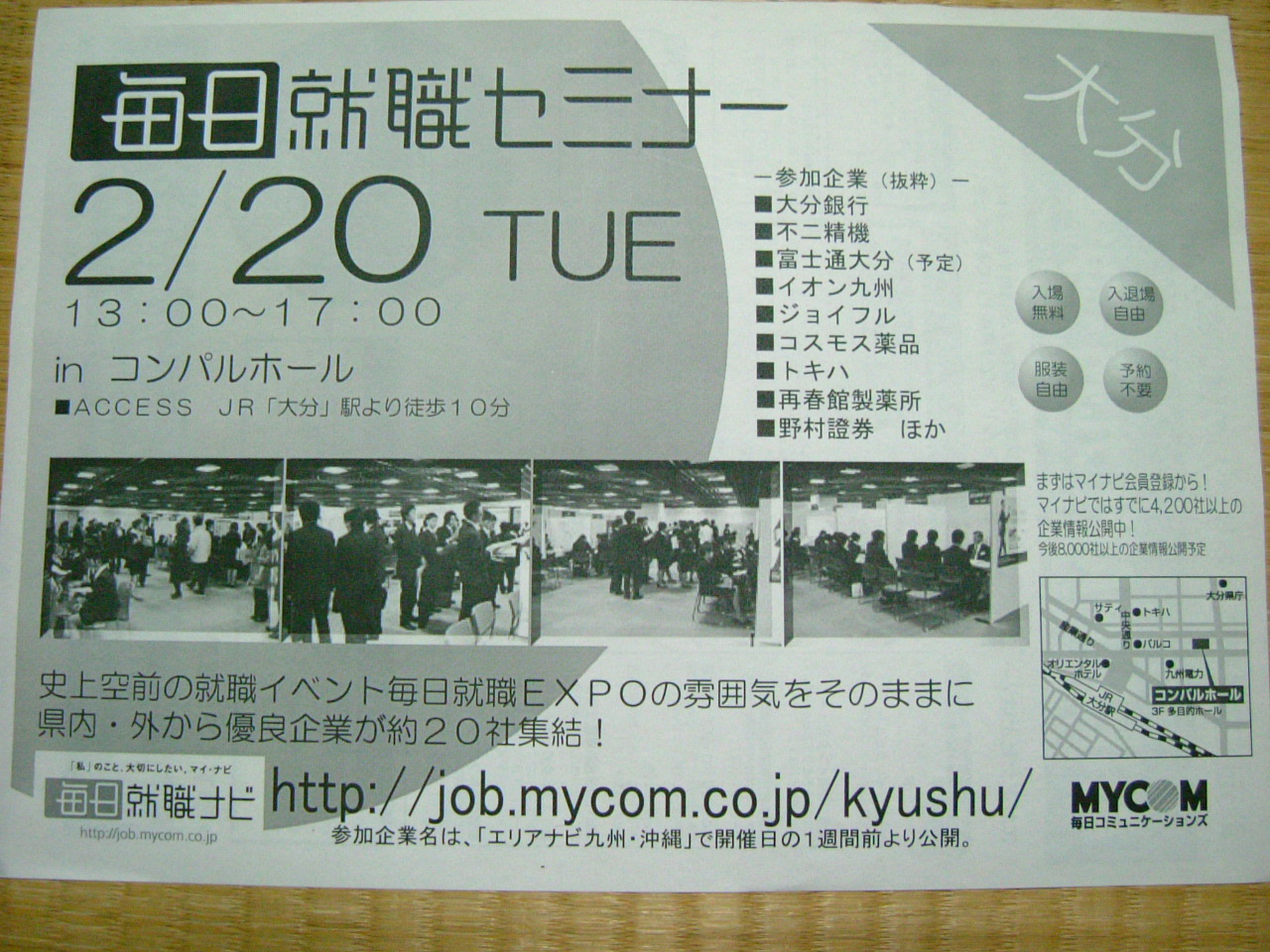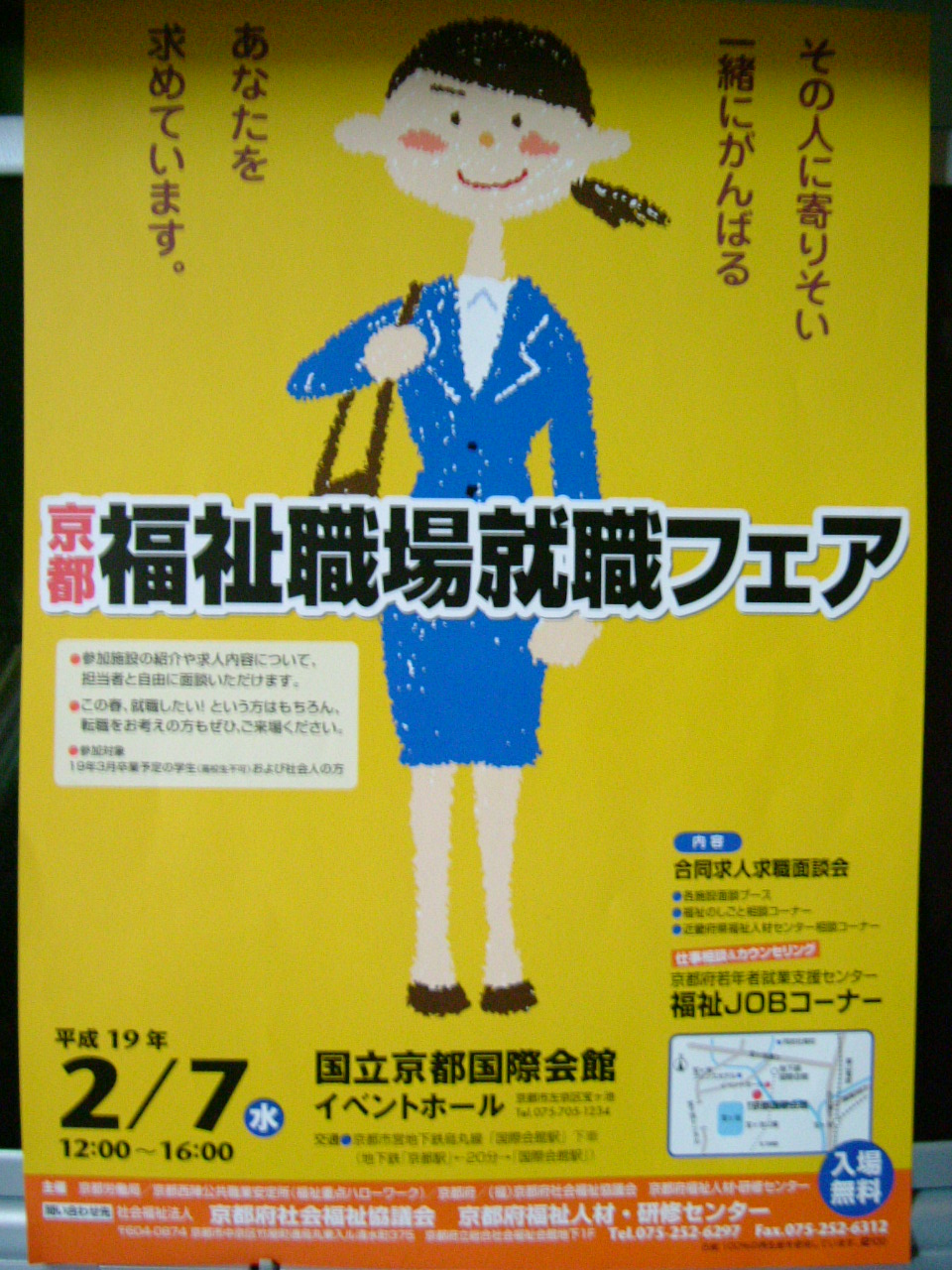 セミナー情報2件←毎日就職セミナー日時:2月20日(火)13:00~17:00場所:コンパルホール参加企業情報は、こちらのページから1週間前になったら掲載されるようです。←福祉職場就職フェア日時:2月7日(水)12:00~16:00場所:国立京都国際会館イベントホール対象:19年3月卒業予定の学生および社会人問合せ先:社会福祉法人京都府社会福祉協議会、京都府福祉人材・研修センターTEL:075-252-6297
