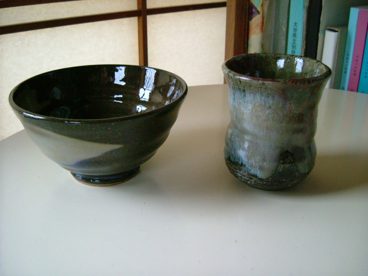 ←で、買ってきた飯茶碗が左側。右側は愛用している小石原国光窯の湯呑みです。いい味出してます。