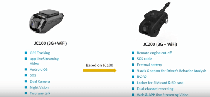 内蔵の9軸モーションセンサーに基づいて、JC200カメラはドライブの動作(過酷な加速、過酷な旋回、および過酷なブレーキ)を検出および報告できます。 JC200にはリレーの付属品があり、リモートエンジンカットに使用できます。 JC100にはドライバーの動作分析機能がなく、リモートでバッテリーとエンジンのカットオフ機能があります。