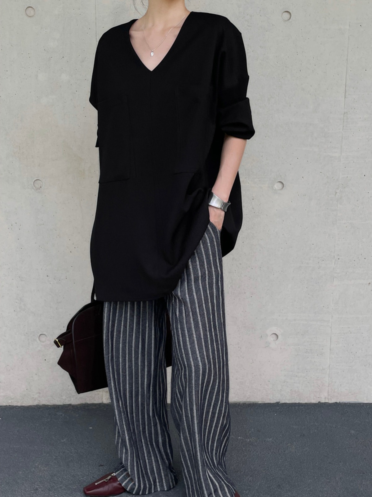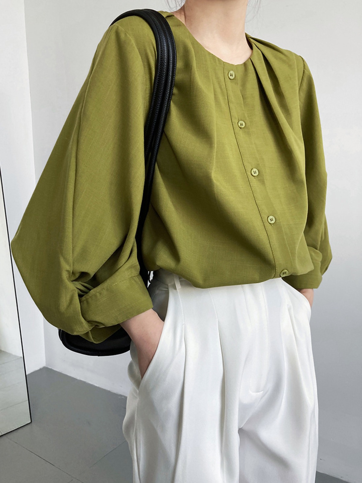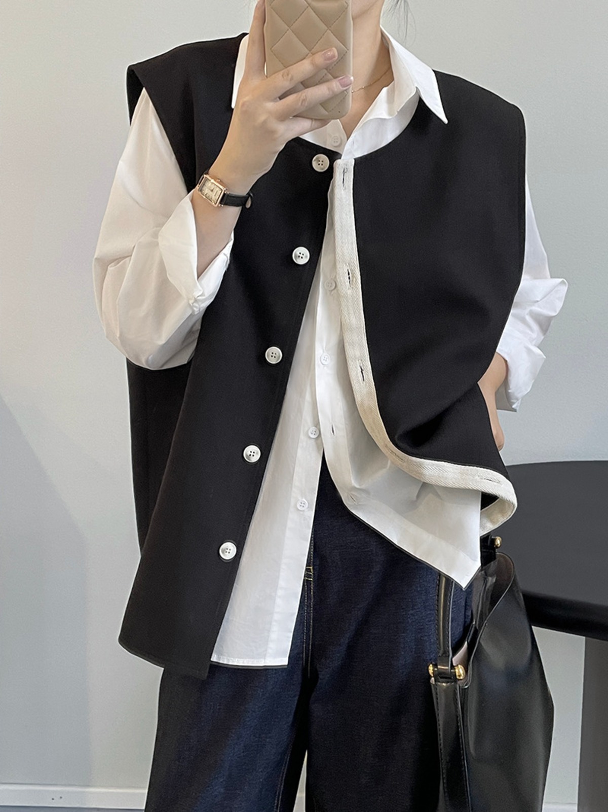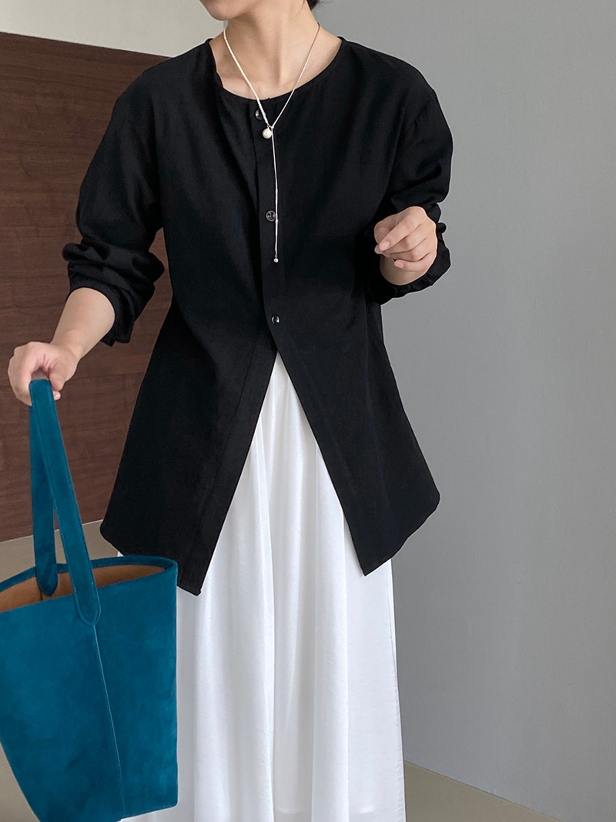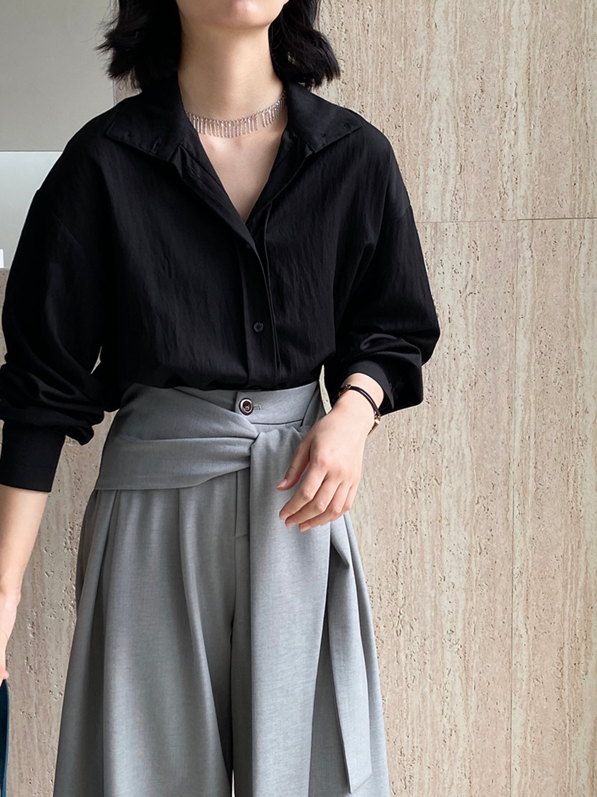 まずは、シンプルながらも万能なフロントボタンブラウスです。「え?黒のシャツ?シンプルすぎじゃない?」って思ったそこのあなた!実はこのブラウス、いざ着てみると何にでも合うんですよ。オシャレ初心者の旦那さんでも「なんか今日いい感じ?」って褒めてくれるかも?!何と合わせても、あの「あ、この人センスあるな」って見えるから不思議。
