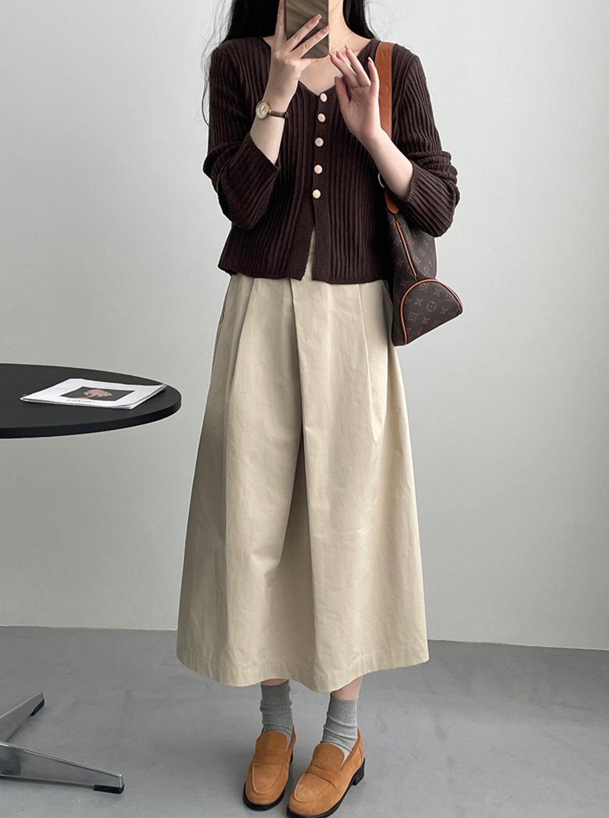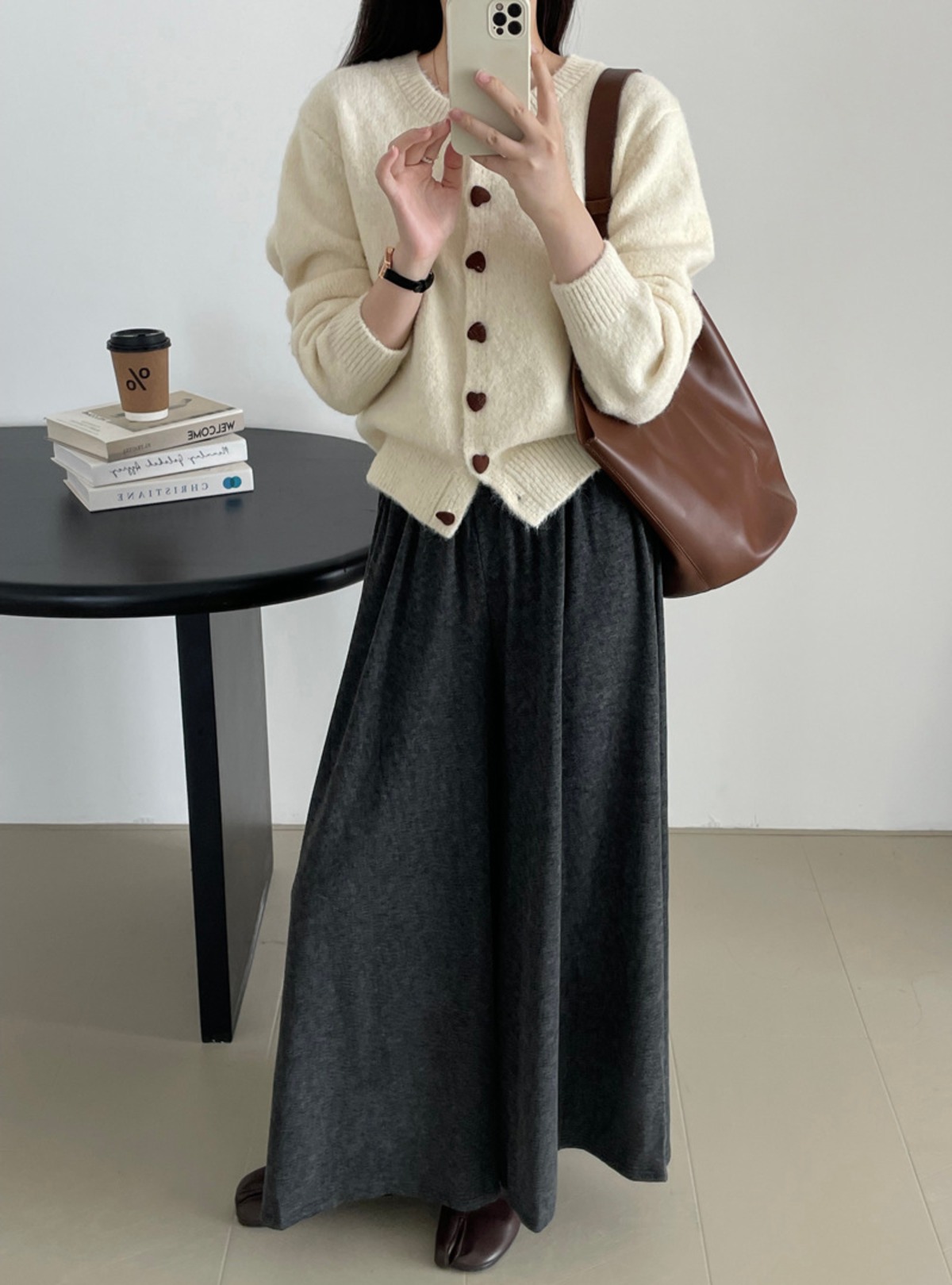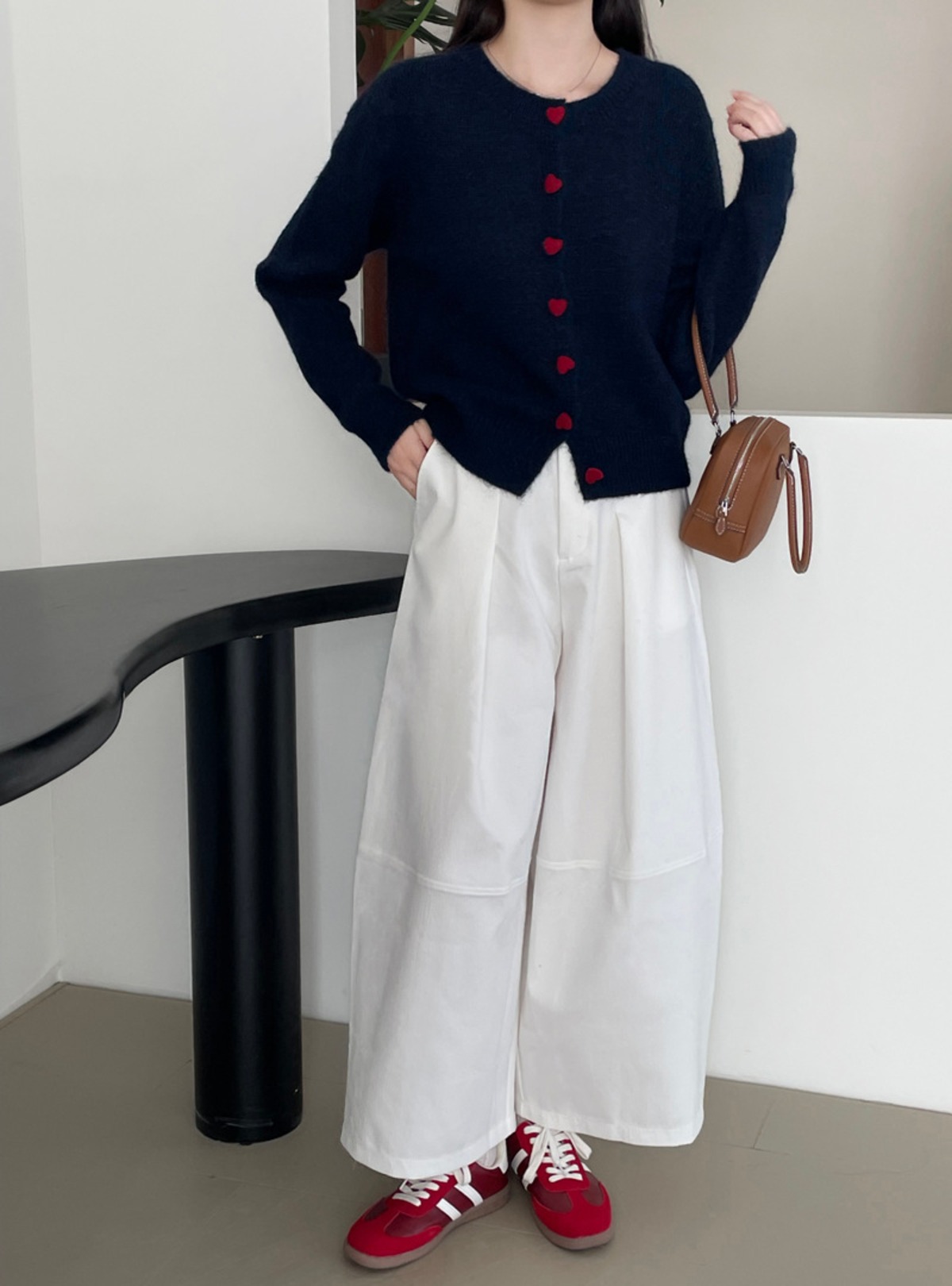 続いて、この可愛いハートボタンのカーディガンをご紹介。普通のカーディガンだと思ったら、よく見るとボタンがハート型で「なにこれ、可愛い!」とテンションアップ。ママ友にも「そのボタン、めっちゃ可愛いね」って褒められます。シンプルな見た目なのに、ちょっとした遊び心があるだけで毎日のオシャレがもっと楽しくなりますよね。