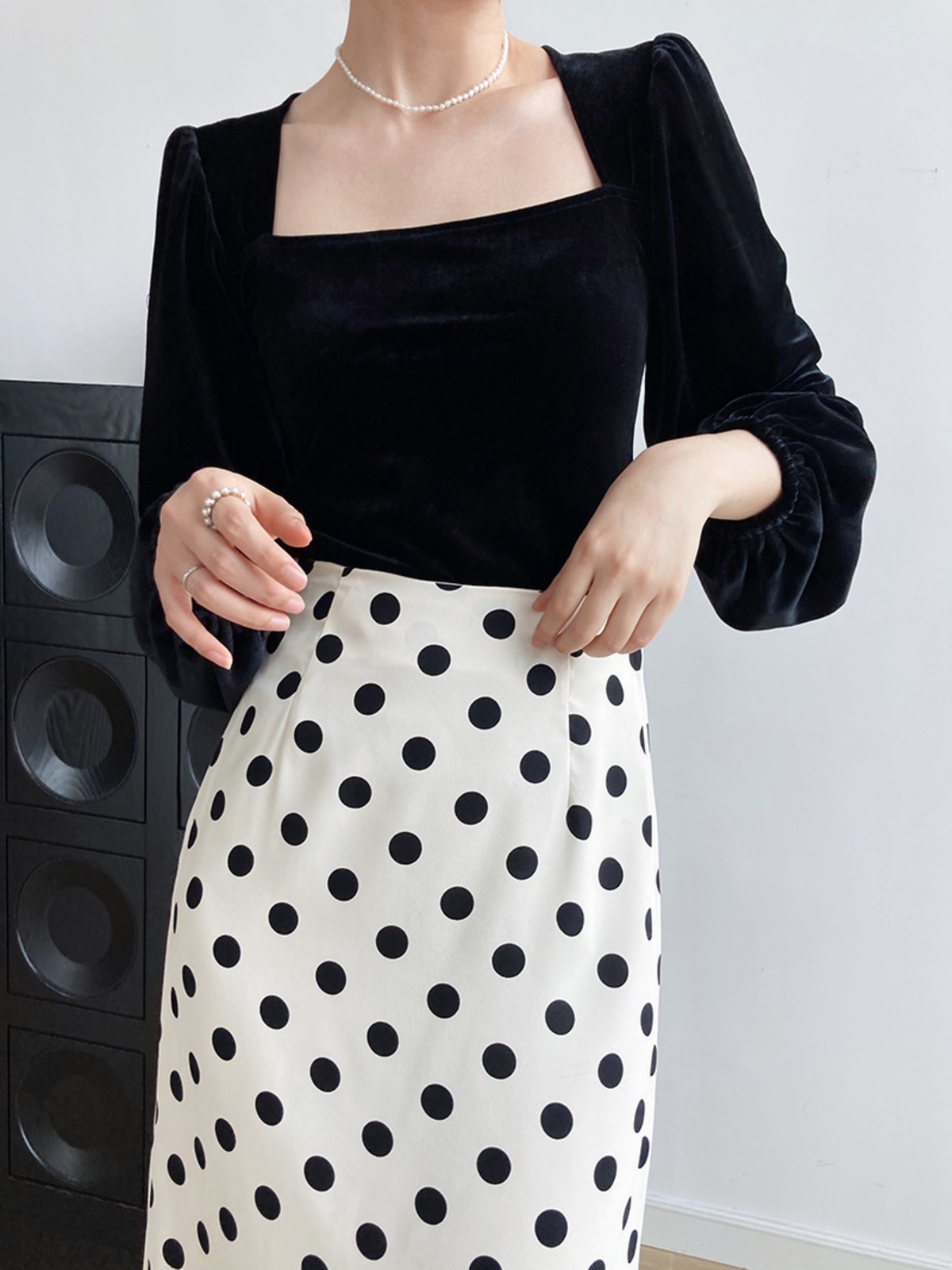 最後にご紹介するのは、ベルベットのスクエアネックトップス。これ、ちょっと特別感を演出したい時にピッタリ。大人っぽいスクエアネックが素敵で、子どもたちにも「今日はお姫様?」なんて聞かれちゃうかも?ドット柄のスカートと合わせると、ぐっとおしゃれ度が増しますよ。特別な日だけじゃなく、ちょっとした日常でも気軽に使えるから、ママ友ランチでも「今日ちょっとオシャレじゃない?」なんて言われること間違いなし!