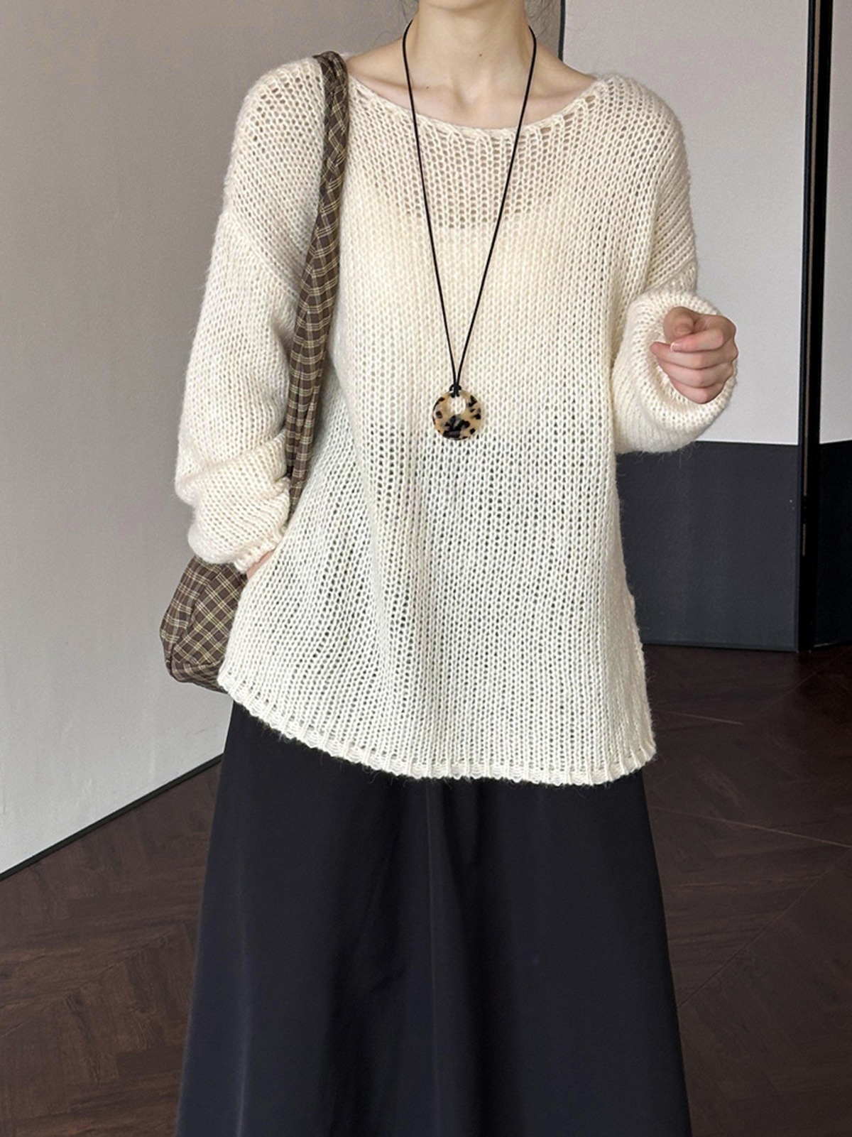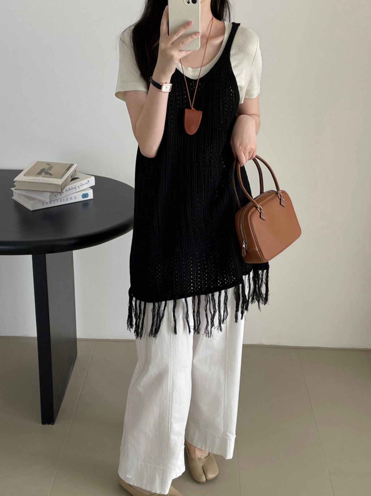 さて、次にご紹介するのは、遊び心満載のフリンジ付きニットチュニック。子どもと一緒にいると、どうしても「引っ張られること」を前提に考えちゃいますよね。だけどこのフリンジ、むしろ引っ張られても「いい感じのアクセント」になっちゃうんです😀。カジュアルなのに、ちょっと大人な感じもあって、何とも絶妙!気をつけな