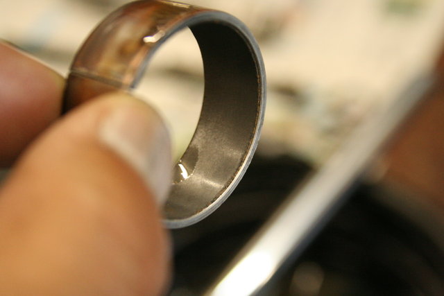 上側(フォークアウターに取り付けられる方)の磨耗はそうでもありませんが、下側(インナーチューブ側)はテフロンコーティングが見事に薄くなっていました。