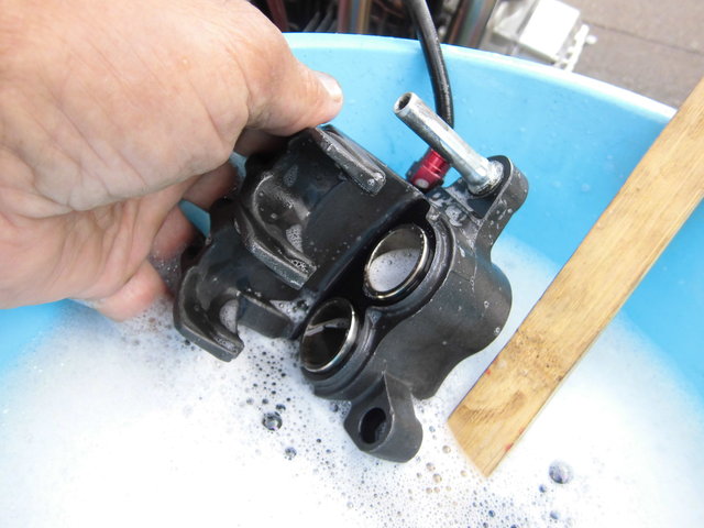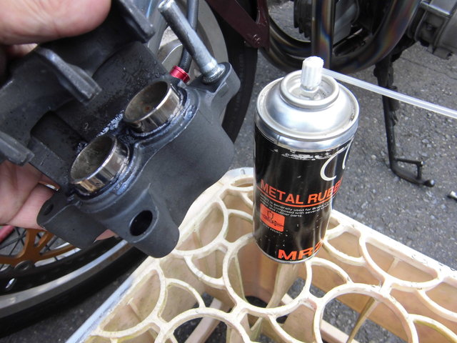 洗い終わったら「CCI メタルラバー」を吹いてブレーキレバーを握ってピストンを出して、ツールを使ってピストンを回転させて、押し戻したり出したり回したりを繰り返し、ピストンがスムーズに動くようにします。