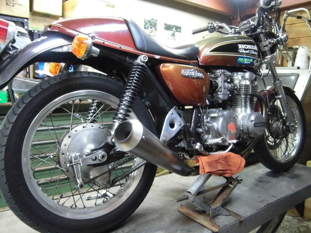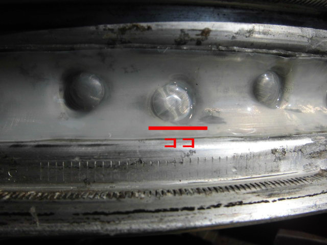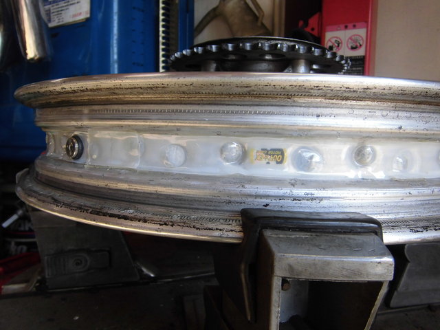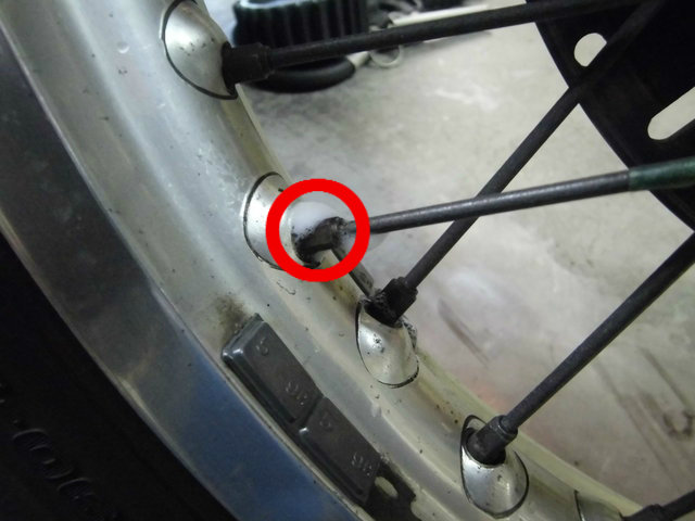 CB550 リヤタイヤの交換とフロントチューブレスの修理12月12日、CB550のリヤタイヤの交換と、 ずっと懸念事項であったチューブレス化したフロントホイールからの 微弱なエア漏れ(2週間で0.2キロくらい)を修理しました。 http://livedoor.blogimg.jp/coo_ray_four2/imgs/4/6/46e93169-s.jpg 作業は役得でTRカンパニーさんで。 http://livedoor.blogimg.jp/coo_ray_four2/imgs/e/5/e51b84c5-s.jpg リヤはほとんど抜ける事はないのでチェックしてタイヤを交換します。 今回のタイヤもブリジストン BT45の110/90-18。 ダンロップ GT601も相当評判がいいので迷いましたが、今回はBT45です。 サクサク交換して、肝心のフロントに移ります。 http://livedoor.blogimg.jp/coo_ray_four2/imgs/f/6/f6db8c21-s.jpg 石鹸水をスプレーしてしばらくするとこのくらいの漏れです。 チューブレス加工してすぐに分かったのですが、 夏場の路面温度の高い時にガンガン走って温度上げれば直るんじゃないかと 淡い期待で夏を越しましたが、あまり走りに行く機会がなかったこともあり、 状況は変わりませんでした。 http://livedoor.blogimg.jp/coo_ray_four2/imgs/6/e/6e918142-s.jpg 裏から見てココなのですが、見た目では何が悪いか分かりません。 http://livedoor.blogimg.jp/coo_ray_four2/imgs/b/0/b0f06c91-s.jpg 修理のやり方は、アウテックスさんのHPにもありますが、スポークが折れて交換する時にも同じやり方でリペアします。 まずは当該部分のテープをカットして剥がす(スゴイ密着で剥がすの結構大変) http://livedoor.blogimg.jp/coo_ray_four2/imgs/c/f/cf0797a5-s.jpg カットしたところと同じサイズで両面テープと専用テープを貼り、更に継ぎ目を覆う長さで両面テープと専用テープを貼ります。 http://livedoor.blogimg.jp/coo_ray_four2/imgs/0/4/041c1f53-s.jpg 見事直りました!! http://livedoor.blogimg.jp/coo_ray_four2/imgs/b/b/bb858aa8-s.jpg 普段青空整備なので、リフトの上に自分のバイクがあることが新鮮w http://livedoor.blogimg.jp/coo_ray_four2/imgs/5/2/52cac0ea-s.jpg 今回の距離は64104kmでした。