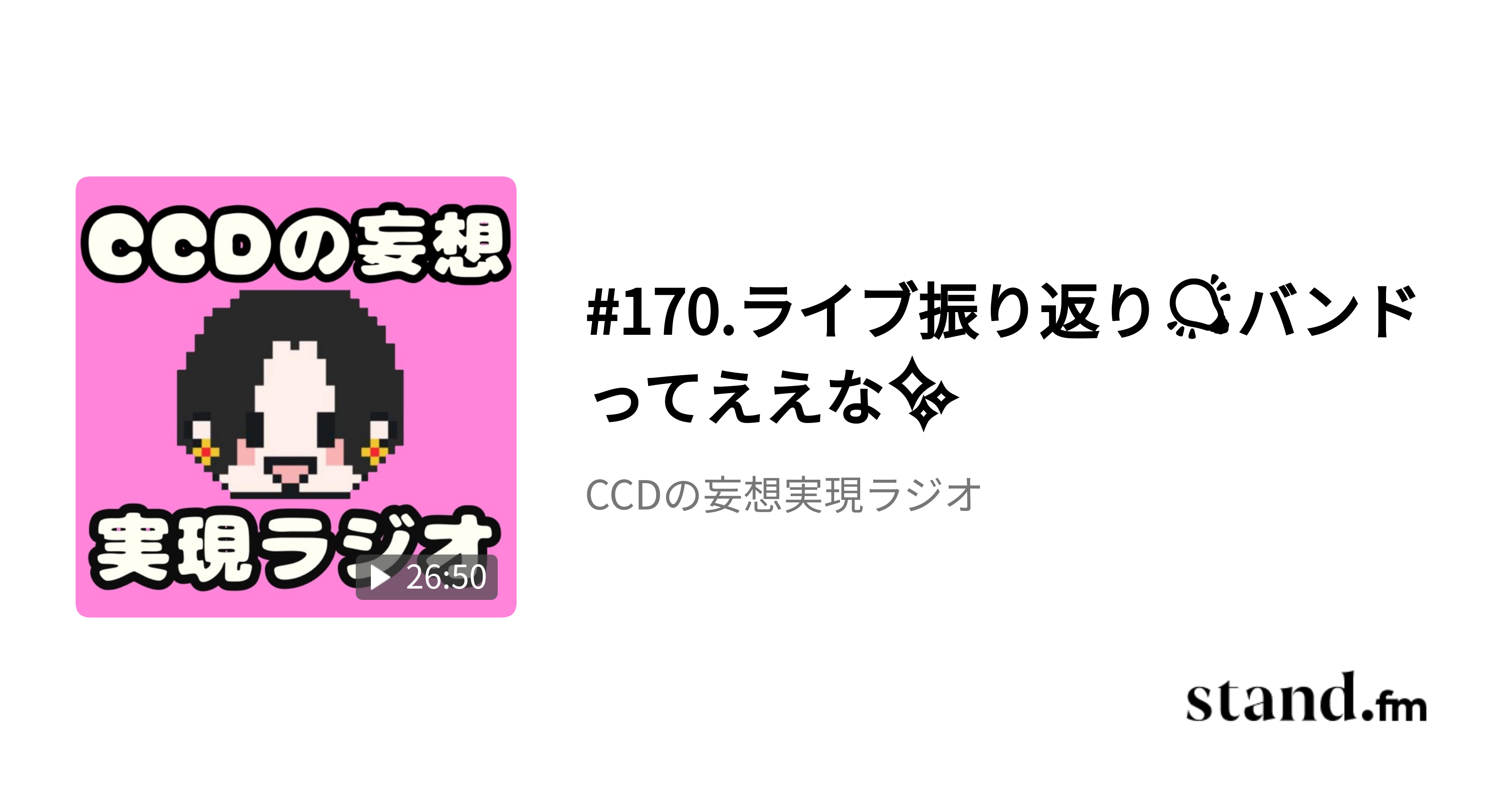 #170.ライブ振り返りバンドってやっぱりええなぁ✨#170.ライブ振り返り第170回CCDの妄想実現ラジオ2022.9.25(日)昨夜急遽出演したライブについて- ̗̀( ˶'ᵕ'˶)今回はユタ州さんの15周年&レコ発ツアーin福島with勃発さんで、私はオープニングアクトやらせていただきました✨バンドっていいなぁと改めて思えた良い日でしたヾ(*´ω`*)ノ今夜の1曲はCCD - Because I’m me【#CCDの妄想実現ラジオ】毎週...youtu.be昨夜のライブ振り返りです✨しゃべりながらテンション高いの自覚してたので私はやっぱりバンドさん好きなんだなぁと改めて思いました(*´艸`)フフ#CCD妄想実現ラジオ はYouTube他複数アプリにて配信中です💡【#Spotify】#170.ライブ振り返り💡バンドってええな✨Listen to this episode from CCDの妄想実現ラジオ on Spotify. 昨夜急遽出演したライブについて- ̗̀( ˶'ᵕ'˶) 今回はユタ州さんの15周年&レコ発ツアーin福島with勃発さんで、私はオープニングアクトやらせていただきました✨バンドっていいなぁと改めて思えた良い日でしたヾ(*´ω`*)ノ 今夜の1曲はCCD - …open.spotify.com【#standfm】#170.ライブ振り返り💡バンドってええな✨ - CCDの妄想実現ラジオ | stand.fm昨夜急遽出演したライブについて- ̗̀( ˶'ᵕ'˶) 今回はユタ州さんの15周年&レコ発ツアーin福島with勃発さんで、私はオープニングアクトやらせていただきました✨バンドっていいなぁと改めて思えた良い日でしたヾ(*´ω`*)ノ 今夜の1曲はCCD - Because I’m me 【#CCDの妄想実現ラジオ】 毎週日曜20時、闘…stand.fm【#ApplePodcast】CCDの妄想実現ラジオ:Apple Podcast内の#170.ライブ振り返り💡バンドってええな✨CCDの妄想実現ラジオの番組、エピソード#170.ライブ振り返り💡バンドってええな✨-2022年9月25日podcasts.apple.com