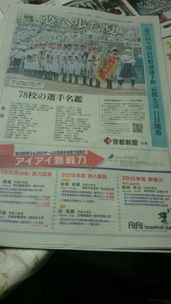おは46夏らしい雲になりつつある京都の朝です。おはようございます。そんな朝刊に高校野球の別冊新聞。組み合わせやメンバー紹介など。高校球児だった自分としては地元の中学や監督の名前をチェックしたりと。昨日も同級生から出身高校の試合の応援の誘いを受けたりと、「夏」なんだなぁ~と実感させられます!