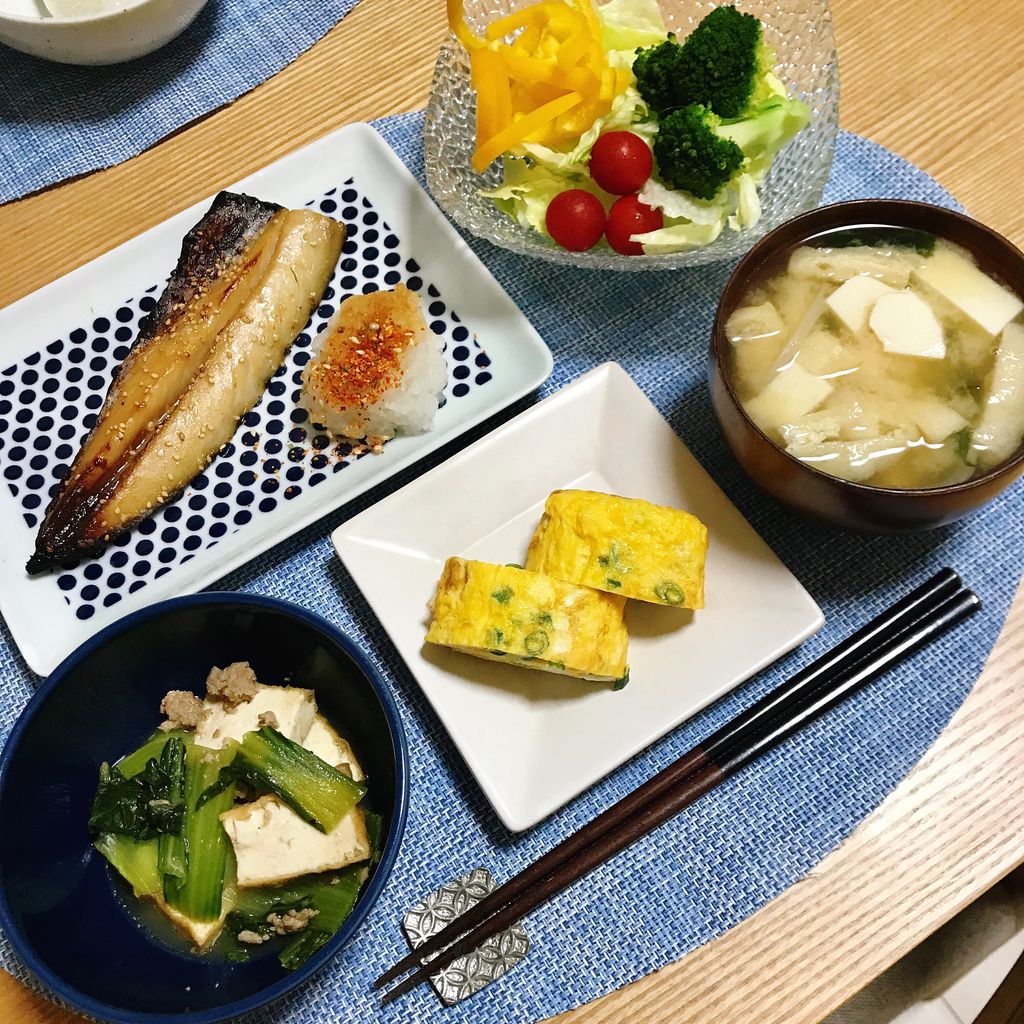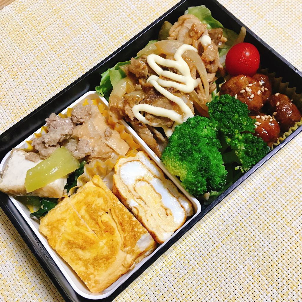 厚揚げと青梗菜のオイスターソース煮(これにて終了)・ほんのり甘いだし巻き卵・豚しょうが焼き・塩ゆでブロッコリー・ミートボール