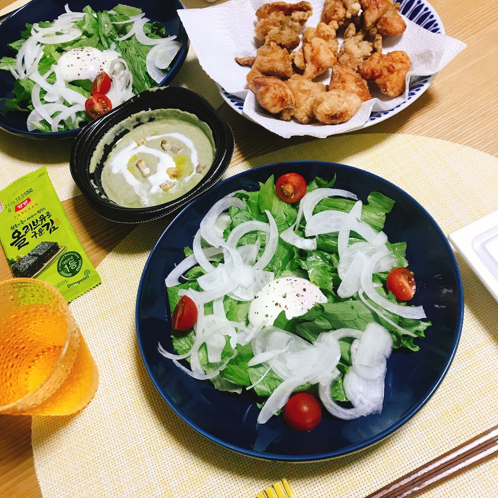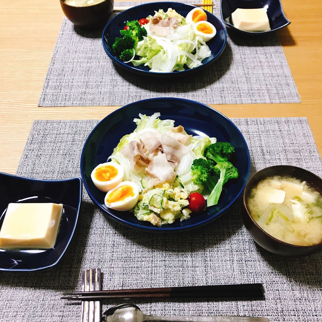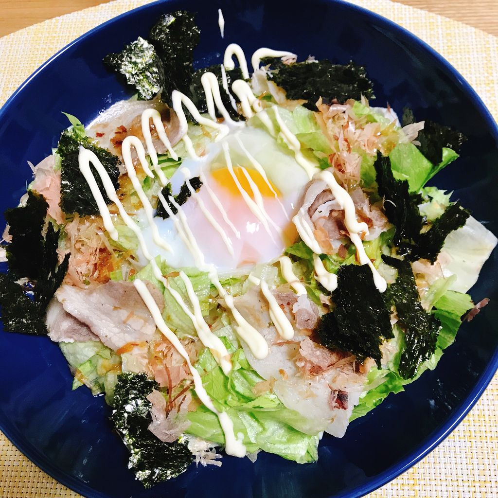そうめん(50g)・レタス・オニスラ・豚しゃぶ・温玉・鰹節・韓国海苔・めんつゆ・マヨネーズです。
