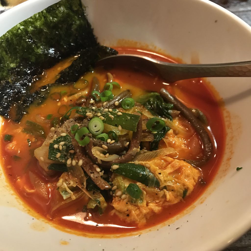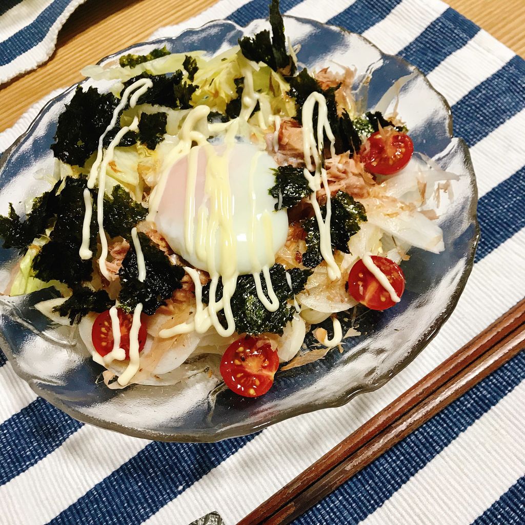 冷凍うどん(半玉)に、レタス・スライスオニオン・シーチキン・鰹節・トマト・海苔・温玉をトッピング。超美味しかった(笑)