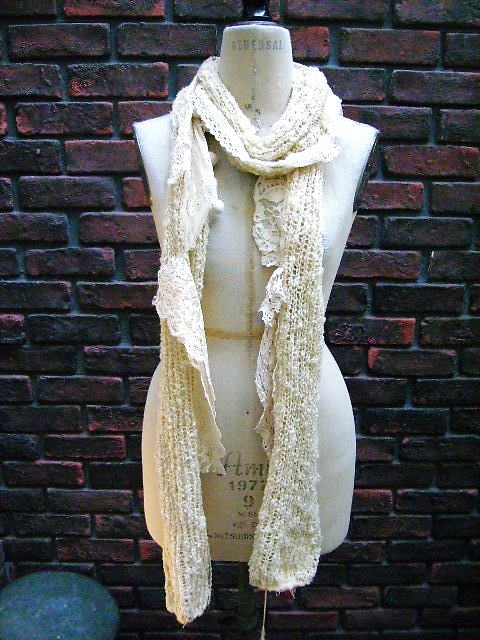 *ニット*以前のブログでご紹介いたしました『編み機』!編み機の大活躍のおかげでブログに載せてありますカワイイ♪ストールがついに完成いたしました!!泣この冬大活躍するに違いないウールの素材の毛糸で編んでおります。柔らかさ肌触りは最高です♪そこになんとまぁ~♪可愛らしいレースの数々を縫い付けており、ナチュラルカラーで仕上げてみました!今年の冬このストールを巻いたコーディネートで過ごしてはいかがでしょうか~♪