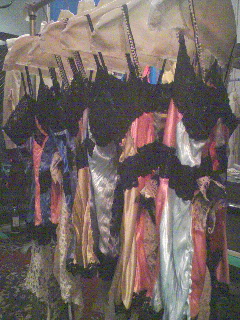 ずらりと展示会用にレイアウトしております、写真はカラフルパッチワークキャミ。ちょっとビビットカラーのサテン地のキャミをリメイクしてみました。さらに後ろにレースをあしらってみました。ほんとにお店が明るくなるくらい、あざやかです。この子達も明日、展示会に出発します。いま、お店は面白い感じになってるかも。毎日このくらい自分のお店にも出せたらなあ、とも思っています、はい。