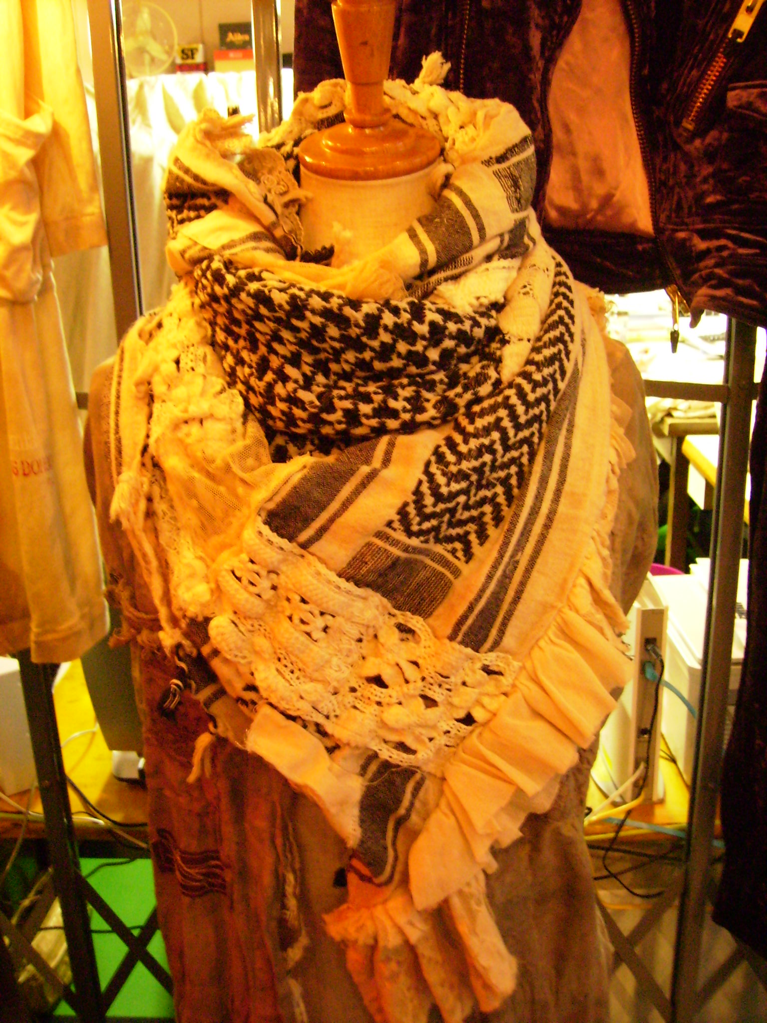 アフガンストールをアフガンストールをリメイクしてみました。レースとフリンジを付けて染めてみました。街で見かけるアフガンストールはすっきりしてるんですけど、ボリューム満点だと面白いかな、と思いまして。巻いてみるとビンテージ名感じがなかなかかわいい。基本レディスですけど、自分がしても結構かわいかったかな、と思います。いろんな人に気に入ってもらえるといーな。