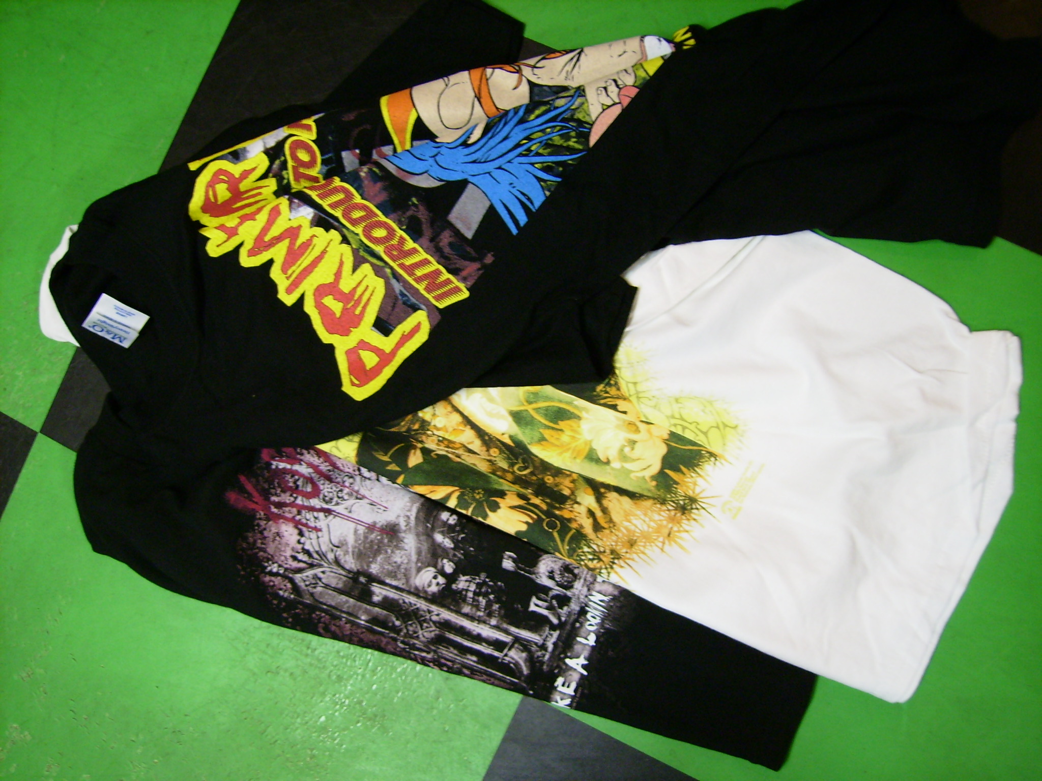 ロックT☆RehersalL 次の新作へ向け、いろいろなアイディアが、アトリエ中を飛び交っています!そんな中今日届いた☆ロックTシャツ!!!!カラフルな配色のプリントやロゴ。色鮮やかなイラストが新鮮です!さぁ~。このTシャツたちがどんなRehersalL色に染まるのでしょうか♪スタッフもドキドキワクワクしています♪完成しましたらブログにてお見せしますのでお楽しみにっ~☆