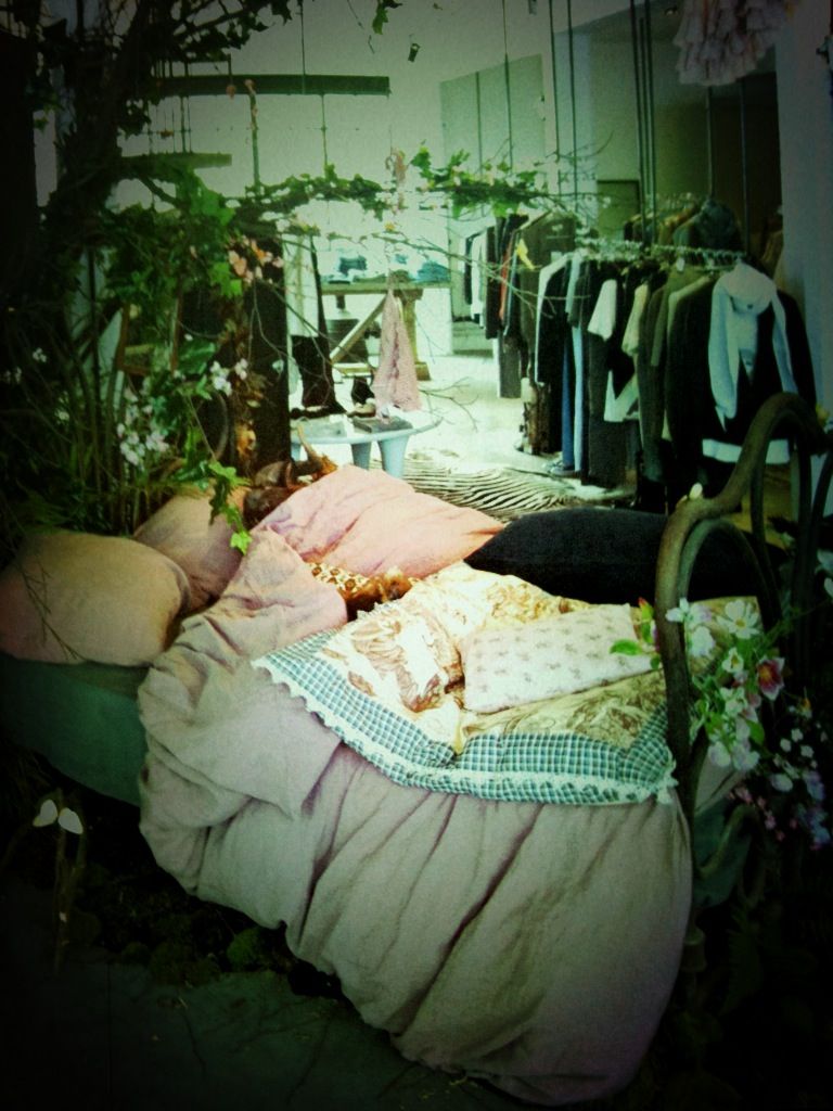 ベッドからにょきにょきと植物が生えているようなディスプレイ