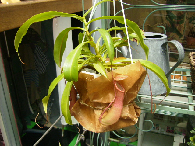 ウツボカズラ♪梅雨に突入したというのに今日もカンカン照りですねっ~。日の光が気持ちいいほどにあたるカオスのテラス。そこに飾ってある植物は少し変わってるんです~!そこで少しご紹介♪この植物の名前『ウツボカズラ』皆さんご存知ですか?壷のような不思議な形をした物体は落とし穴式で虫を捕らえるようになっているらしいですよ!しかも虫を誘うために壷の中に蜜のようなものがはいっているんです!見た目は可愛いのですが、調べてみると意外な事実でびっくりです。枯れないように大切に育てていきます~!