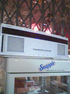 ロボットの顔の様でもある店内のオーディオがいつもラジオでしたので、ちょっと雰囲気を考えて購入しました。とはいえ、狭いファクトリーなので、置く所がありません。仕方なくおいてあるのが冷蔵庫の上。形が形なのでロボットのように見えます。でも音はなかなかいいものです。