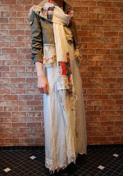 ミリタリー×レース☆今回の展示会では軍物を使ったミリタリーなものとレースを使用したドレッシーなものなど二つのRHLをメインに展開しましたそんな今回の展示会を思わせるコーディネートです。(・∀・)ドレッシーなロングワンピースにミリタリーなショートジャケットを羽織り、パッチワークストールをぐるりとちょっといつもと違って新鮮なコーディネートに仕上がりましたこのバランス感、是非これからの季節に取り入れてみて下さい~通販希望の方はChaos BohemiaHPから