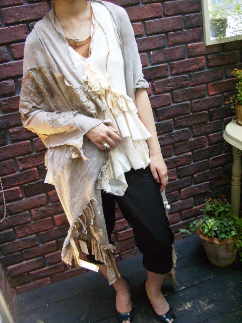 レーヨン♪今日は夏がそこまできていることを感じれる一日でしたね♪暑いときエアコンがきいた部屋で涼みたいものです。けど。。。時にはエアコンがききすぎて寒かったり。。。そんなときにレーヨンのストールが大活躍なのです!!!ものすっごく肌触りがいいので、薄着の上から直接はおっても全然OKなのです♪暑いときは腰に巻いたり、バックに巻いたり♪ほんとに優秀なストールなんですよ♪今日はグレーで大人なスタイリングにしてみました♪