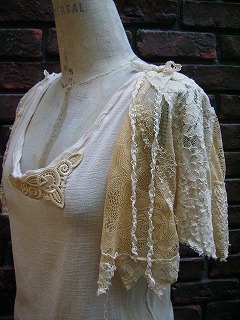 今度はお袖付き*大好評のガーゼタンクトップシリーズがさらに大人っぽく、そして可愛く、お袖が付いて新しくなりました。お袖は、開くと扇のようなかたちで、腕周りのシルエットをきれいに見せてくれます。肩にはレースのリボンが付いてアクセントに結んだり、垂らしたりできますよ。一番のポイントはフロントのアンティークレースのモチーフですね*これを着て、雨のジメジメを吹き飛ばしちゃってくださーい!!*ガーゼタンクトップHBGE