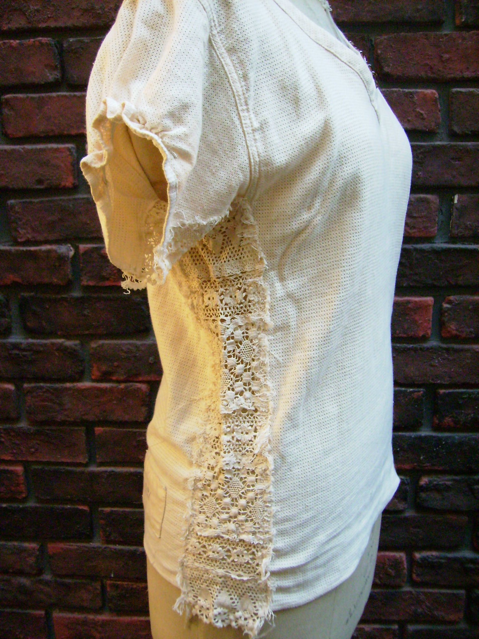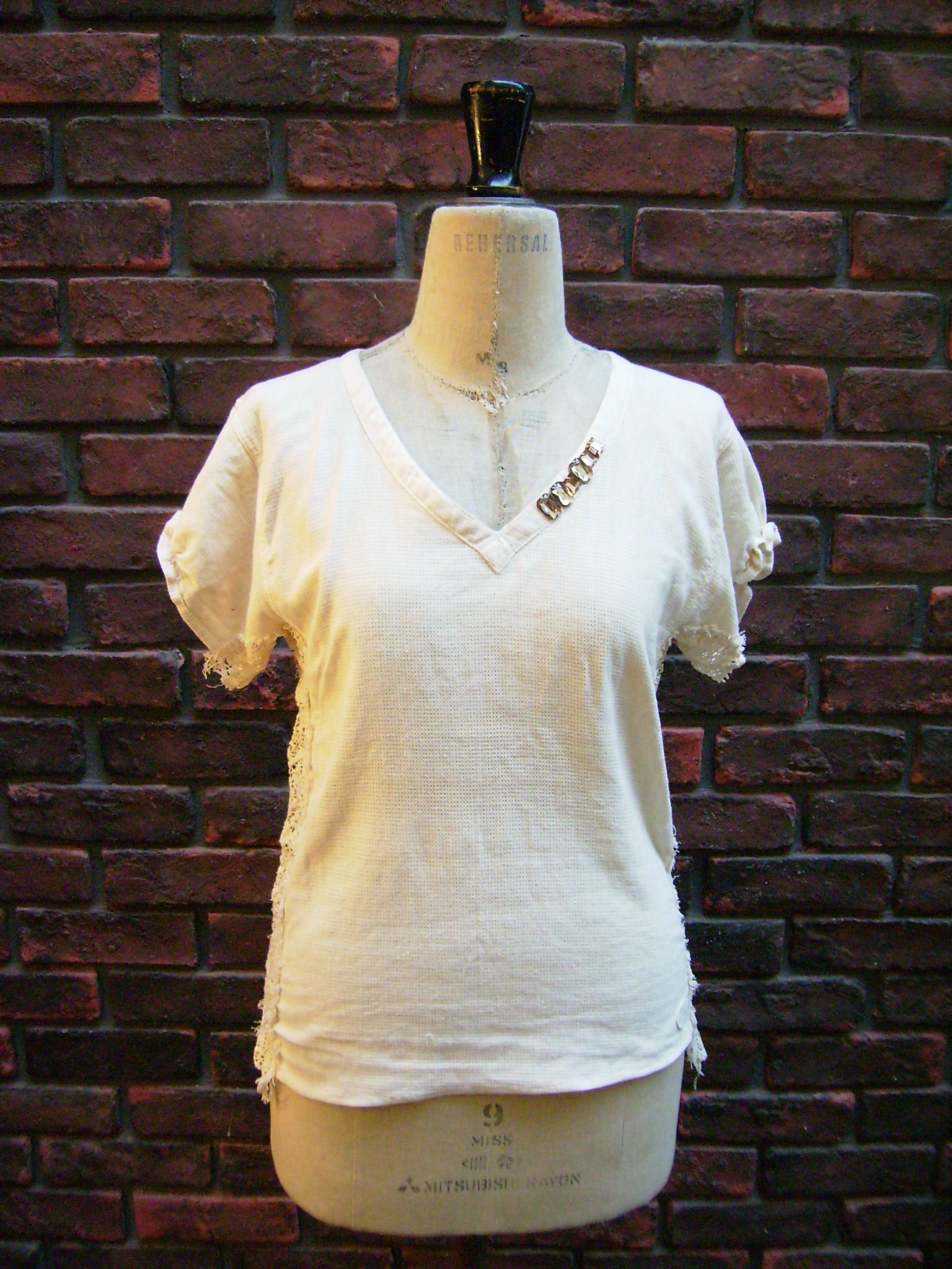 Vネック♪夏にピッタリの♪紅茶染めのTシャツ、リリースです☆軍物のTシャツ。女の子が着るにはシンプルすぎる・・☆ということで、ハサミを入れ、レースを入れ、出来上がったデザインは、袖にはクシュっとした形のデザインを加え、脇のサイドにはレースのパッチワークを施ました。そして、胸元にはさりげなくキラキラ光るチップを飾ってみましたよっ♪夏のコーディーネートにどうでしょうか☆