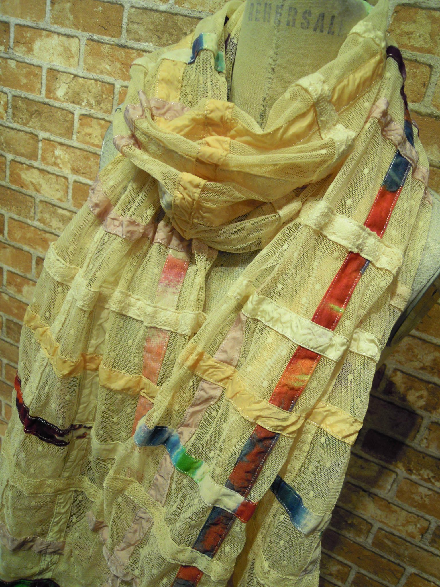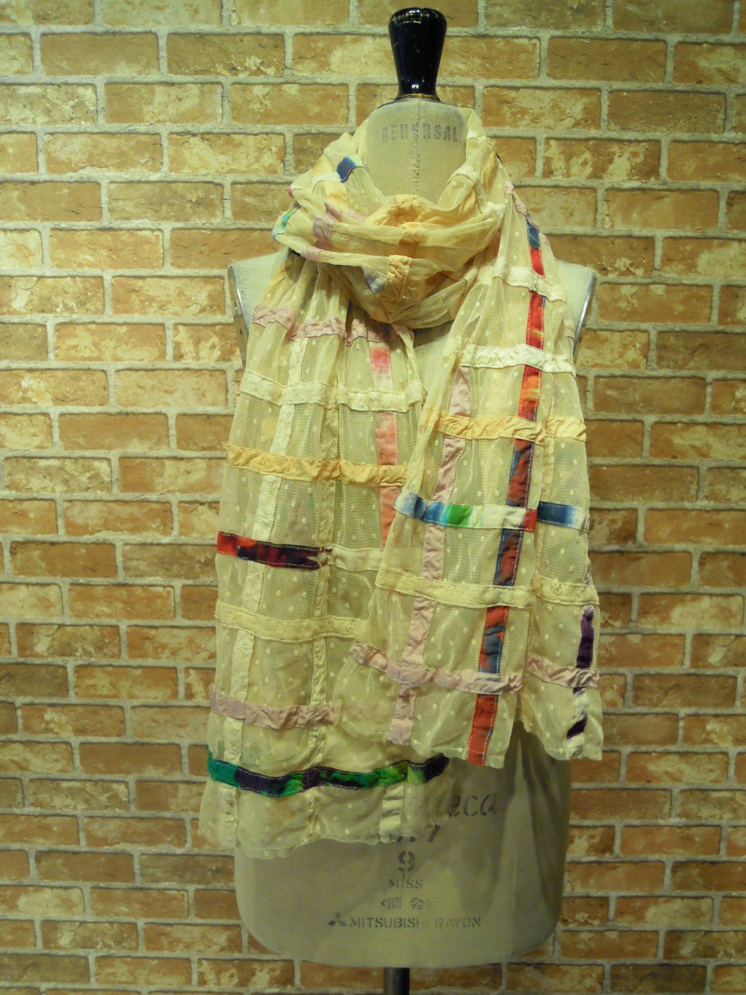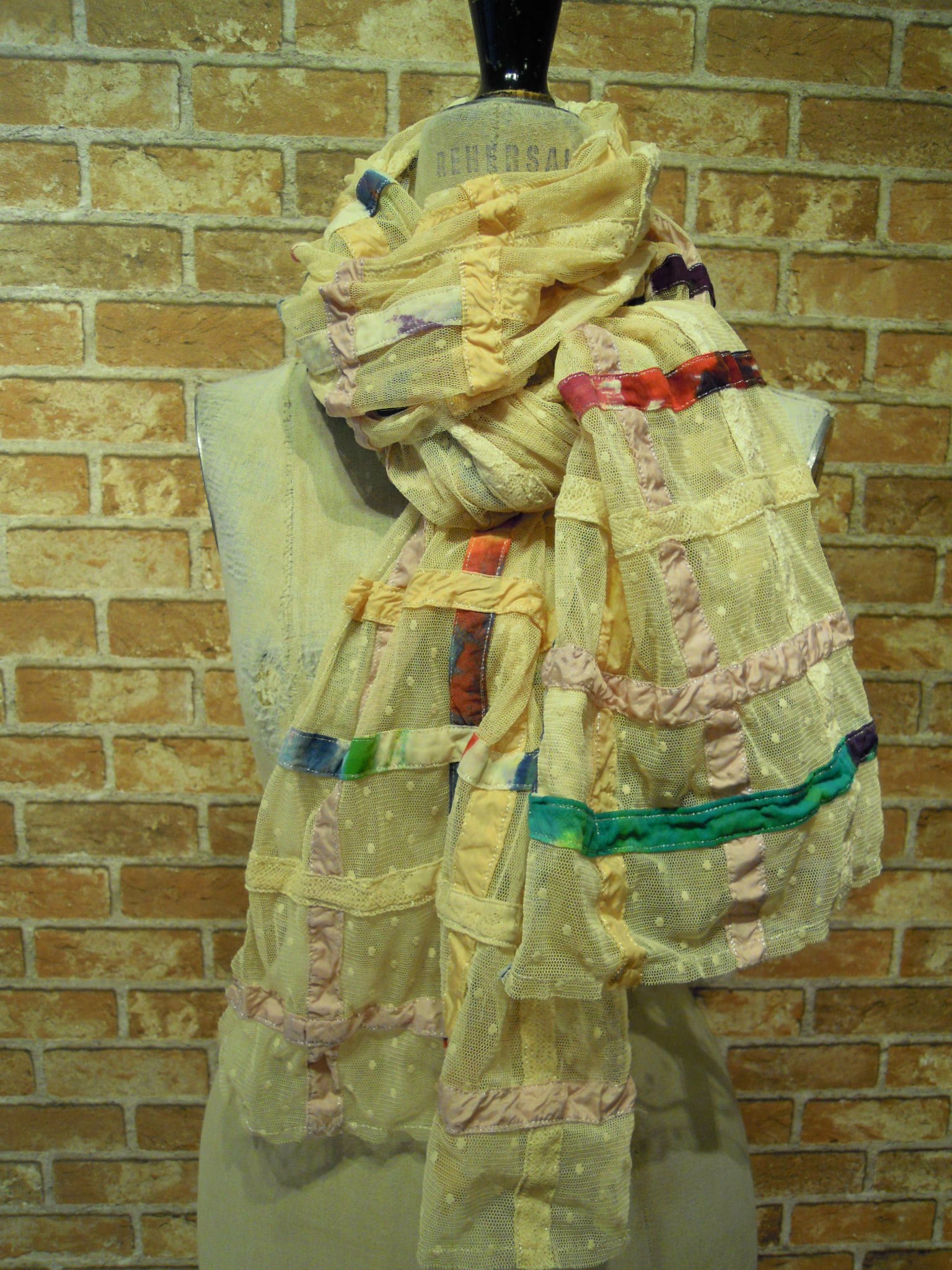 春色ストール☆生地テープを使用したストール、他にもこんなかわいいストールが登場しましたよ♪以前カラフルな生地を使用した、切り抜きストールをご紹介しましたが、こちらはドットのレース生地の上にキュプラとレースと花柄カラフル生地テープをたたいています☆紅茶に染まったレース生地と、春色のキュプラに、ポイントにカラフルな生地をいれて♪小さくくるっと巻いてもかわいいですよ♪気になる商品がある方はこちらをクリックしてください。通販希望の方はChaos BohemiaHPから