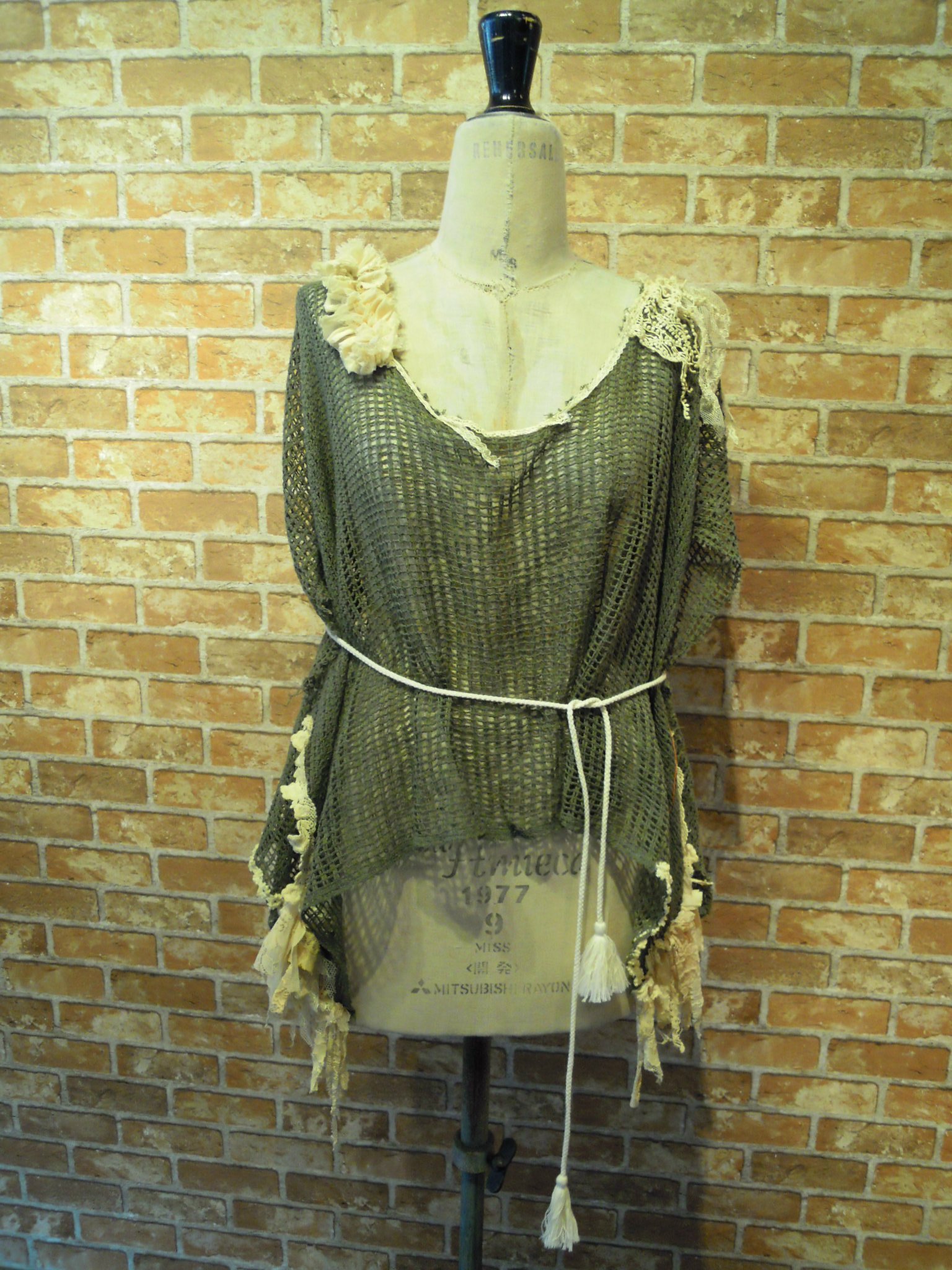 ポンチョでもストールでもイギリス軍のメッシュスカーフをリメイクしたポンチョ。ちょっと古めのスカーフで、なかなか手に入りません。コットン100なので肌触りがものすごっく優しいんです。そのスカーフに色んなレースをつけて、ベルトもつけてポンチョにしてみました。メッシュですので、ストールとしても使えるんです。この2ウェイがいいですよね。暖かい日がドンドン多くなって日差しも厳しくなってきます。そんな季節に大活躍すると思いますよ!!オススメの一枚です。