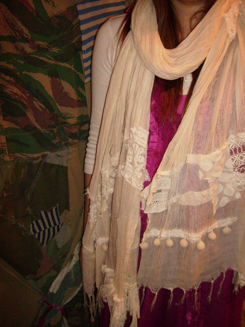 やっと手に入りました*ご好評につきなかなかスタッフでも入手困難だったレースクラフトロングストールですが、やっとスタッフみんなの手元に届きました。早速みんなおそろいで巻いています。スタッフの一人のコーディネイトをパシャリ*マゼンタのシルクシフォンドレスに紅茶で染めたストールが映えます。レースの配置が1点ずつ違うので、同じものができないんです!まだまだ人気の火は消えそうにありませんが、皆さんの手元に届きますように頑張って作ります*レースクラフトロングストールベージュグレーブルーピンク