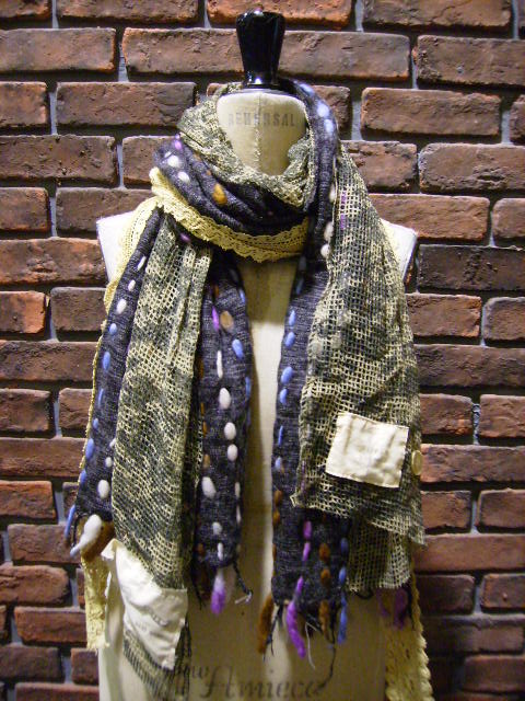 カラフルもこもこ刺子ストールその3しつこいですか、しつこいですよね。でも、そのくらいバージョンがあるんです。今回紹介はメッシュタイプ。先日紹介したもののレースの部分がメッシュになっています。黒とか、カモフラージュ(それもなぜかデジタルカモといわれる最近の迷彩柄)のメッシュが大胆にバーン!!と貼られています。でも、いざ巻いてみると、パープルやらイエローの刺子がメッシュからちらっちらッとみえて凄くキュートであります!隊長!!クリスマス限定モデルでありますー!!隊長!!