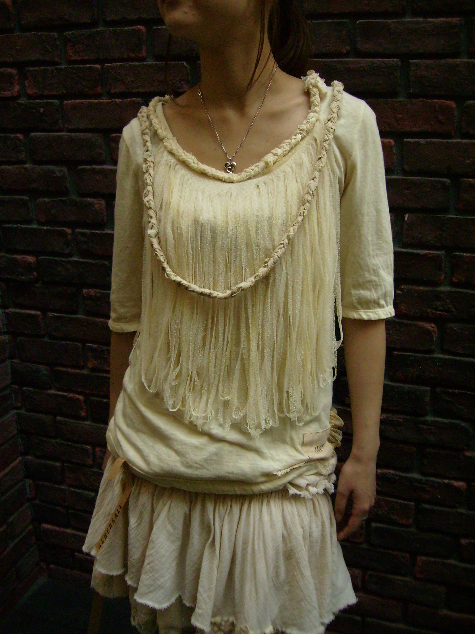 フリンジと三つ編み*先日のTシャツに続きまして、続編です。同じデザインのベースTシャツを使ってるんですがこんなに雰囲気が変わるものでしょうか?レースの1枚の生地からできたフリンジに、レースを編みこんだ三つ編み。レースをつなげて縫ったり、貼り付けたりとは違うレースの技法が光ります。ギャザーを寄せたボリューム感とはまた違い面白い雰囲気を出しているTシャツです。フリンジカットソーBBGE*手の込んだ商品になりますので、数に限りがございます。ご了承くださいませ。スカートは別物になります。