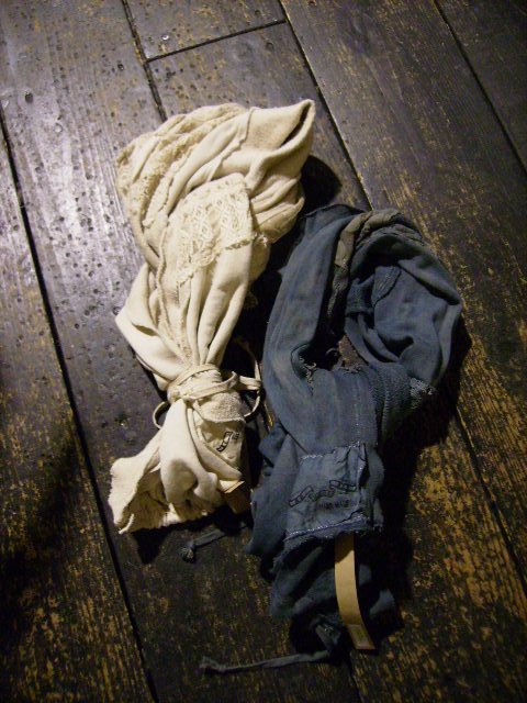 スウェットストール今回ご紹介するのはスウェットストール。表と裏が交互にパッチワークされていて、裏面はパイル地になっています。きりっぱなしではなく、前面にロックがかかっていてこれが可愛いんです。実はこれ、スパッツのリメイクなんです。腰紐をそのまま残しているので、絞りを入れたり、結んでみたりいろんな表情が付けられますよ。レースがちらりと見える感じがいいですね。色はBGEとGRYの2色です。