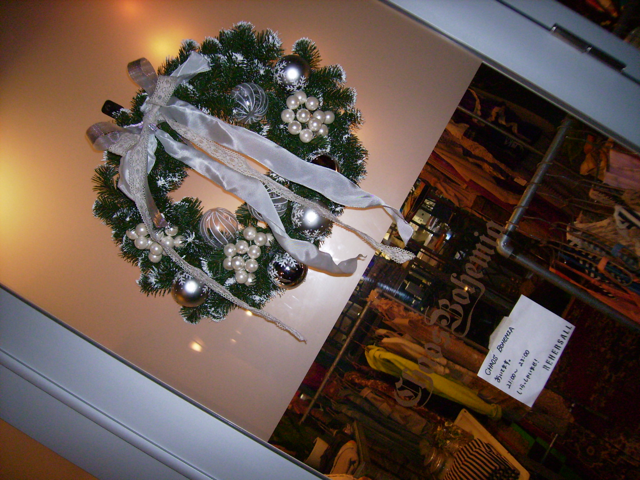 メリー☆クリスマス今年のクリスマスもあとわずかとなりました。ウィンドーに飾ったこのリースも、もう今日までです。しまうのが、少し悲しい。。街のクリスマスイルミネーションの灯りもポツポツと消えていくのかぁ~~と思うと少し悲しい。。。でもこのリースまた来年活躍してもらうためにも、ホコリかぶらない様に綺麗に収納しておきます!!