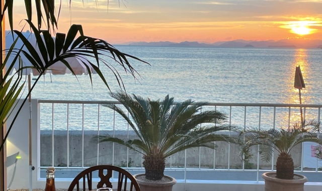 店内から見える静かな海が