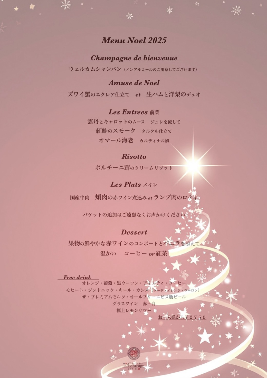 コース ¥11000 フリードリンク ¥2750(それぞれ税込)