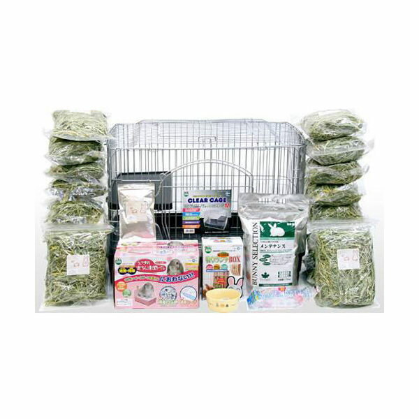 生後7ヶ月以上の成うさぎ用!仲良く暮らせる飼育セット!生後7ヶ月以上の成うさぎ用のフードがついた、うさぎ飼育の必需品が全て揃ったスターターセットです。うさぎ飼育の簡易説明書付でうさぎと仲良く暮らせるお買い得なセットになっています。私のペット?うさぎと仲良く暮らすセット? 成うさぎ用セット内容●クリアケージM・・・簀子2枚、クリアカバー、引き出し、ハンギングトレイ付のひろびろゆったりしたケージです。・・・サイズ:W820×D565×H605(mm)●うさぎの楽ちん清潔トイレ・・・ウンチとオシッコが混ざらない「セパレート・クリーン構造」のトイレです。・・・スコップ・専用消臭トイレ砂約0.4L(約1
