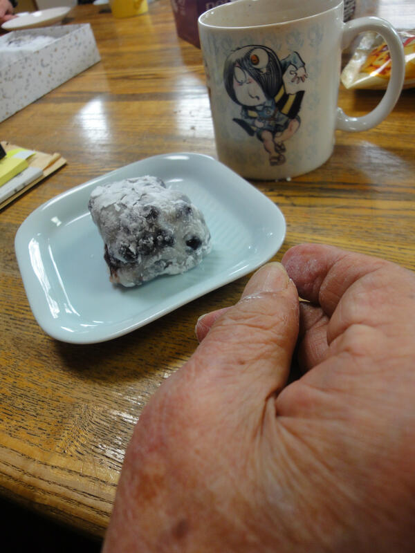 今日のおやつ@水木プロ。大福もち。水木しげる先生の手が大きく写りこみました。先生は、「大変意義のある写真ですな」とおっしゃいました。お顔を撮らず、ごめんなさい先生。(倉ぼっこ) pic.twitter.com/rvmHl9B2iA